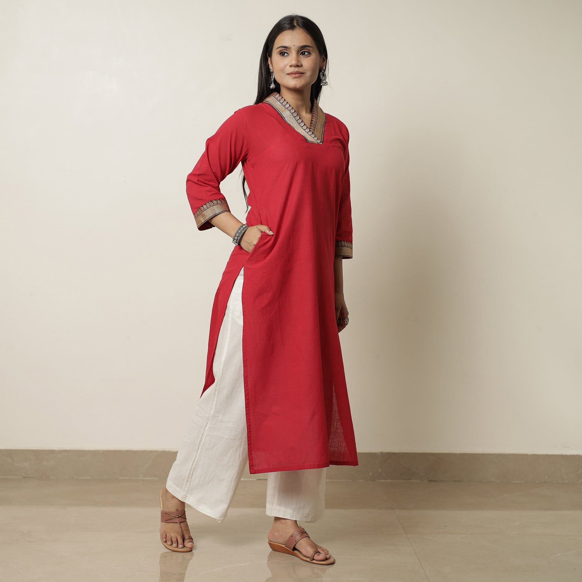 Look and feel beautiful in this uniquely designed Dharwad cotton straight long kurta. This exquisite kurta is crafted from fine-quality cotton fabric, ensuring a comfortable feel against your skin. It boasts exquisite dharwad border designs on the neck and sleeve, adding a touch of elegance to your ensemble. The kurta also features a convenient one-side pocket, perfect for carrying small essentials. This cotton kurta makes you comfortable all day long. This kurta is perfect for your daily outing and for a special occasion.