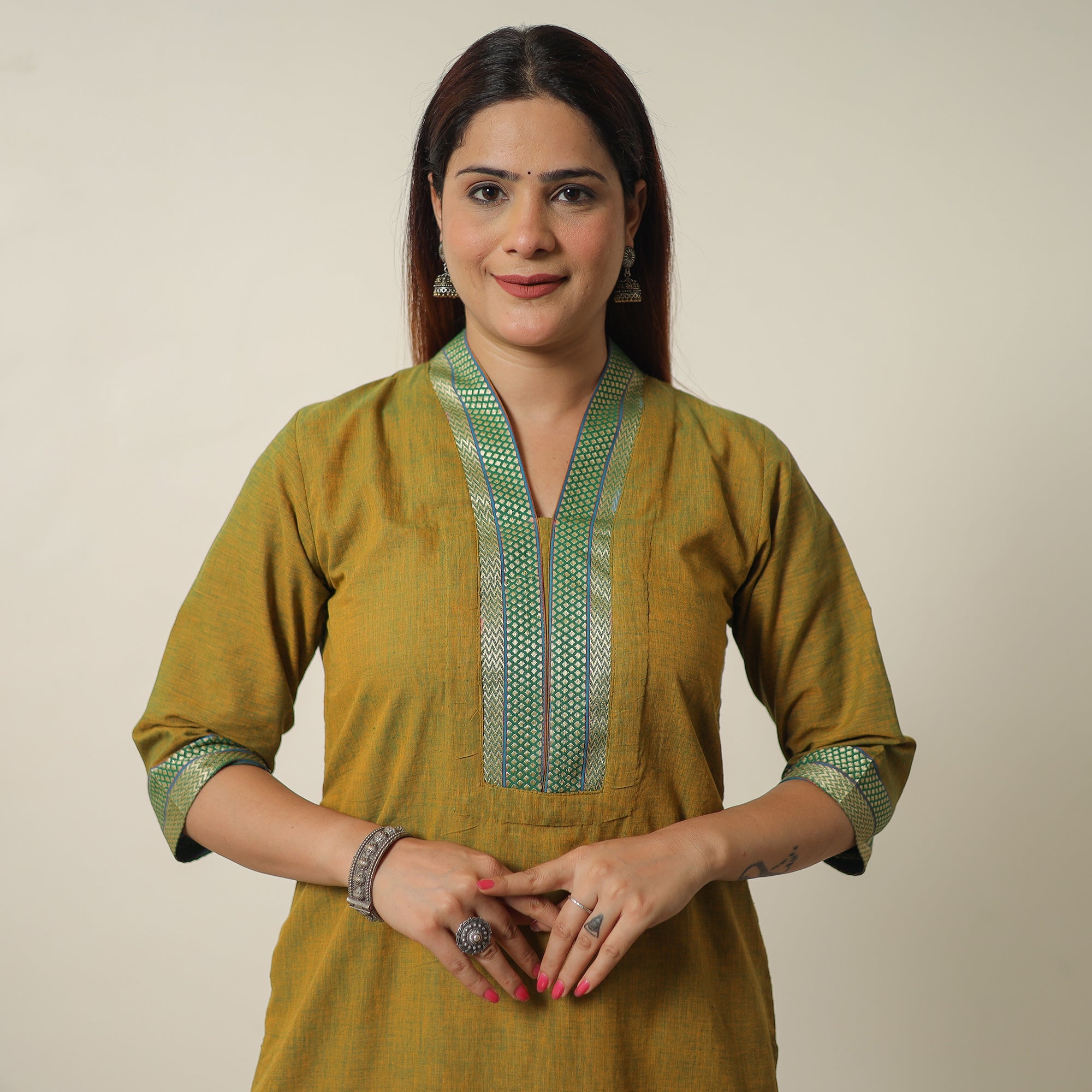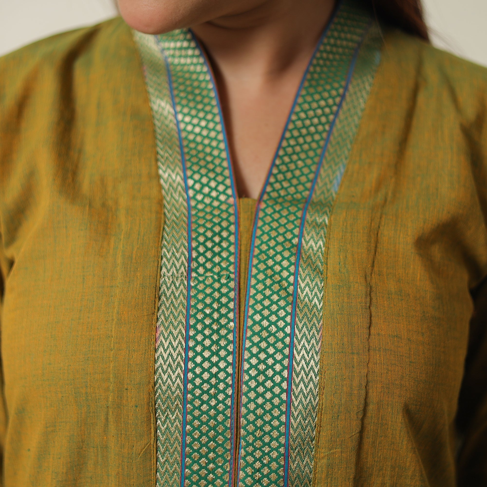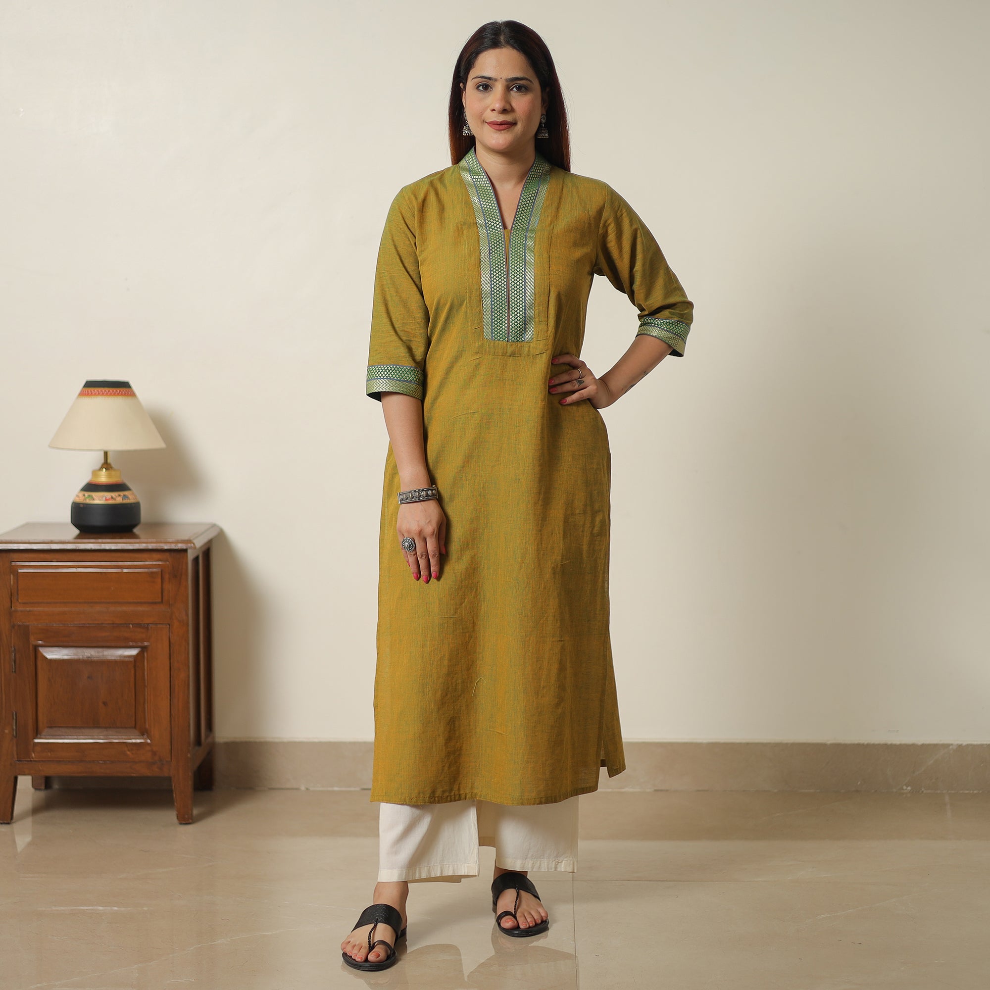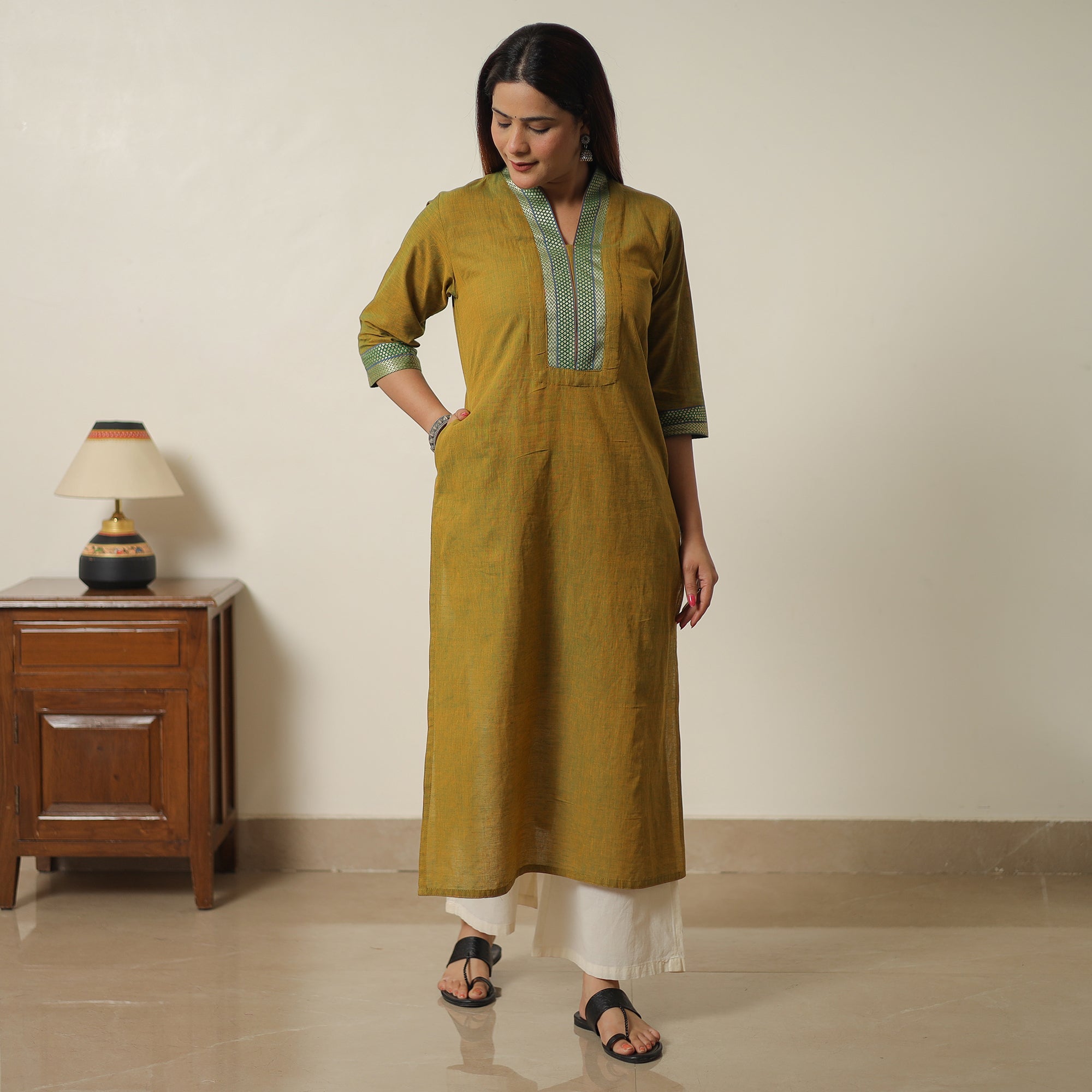 Look and feel beautiful in this uniquely designed Dharwad cotton straight long kurta. This exquisite kurta is crafted from fine-quality cotton fabric, ensuring a comfortable feel against your skin. It boasts exquisite dharwad border designs on the neck and sleeve, adding a touch of elegance to your ensemble. The kurta also features a convenient one-side pocket, perfect for carrying small essentials. This cotton kurta makes you comfortable all day long. This kurta is perfect for your daily outing and for a special occasion.