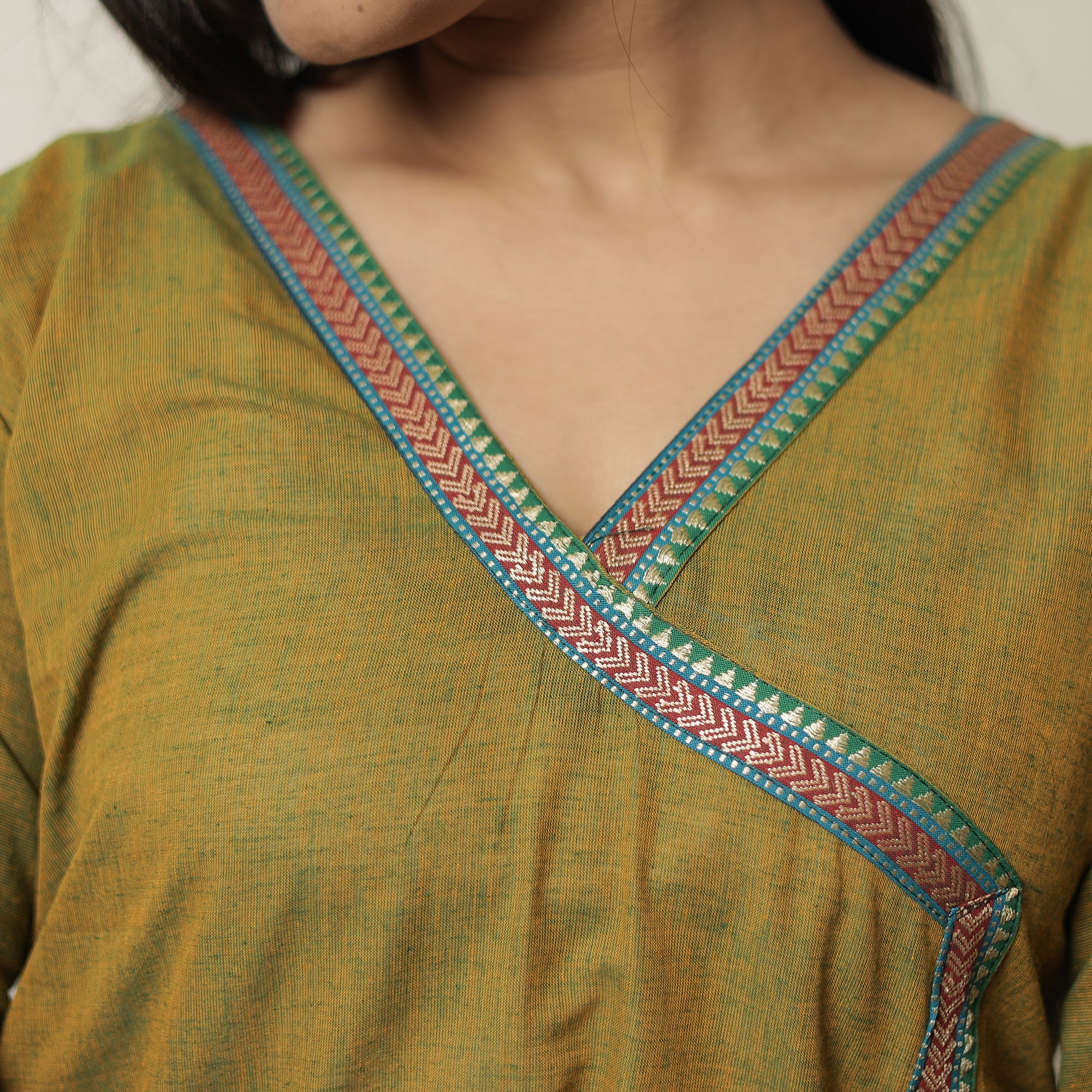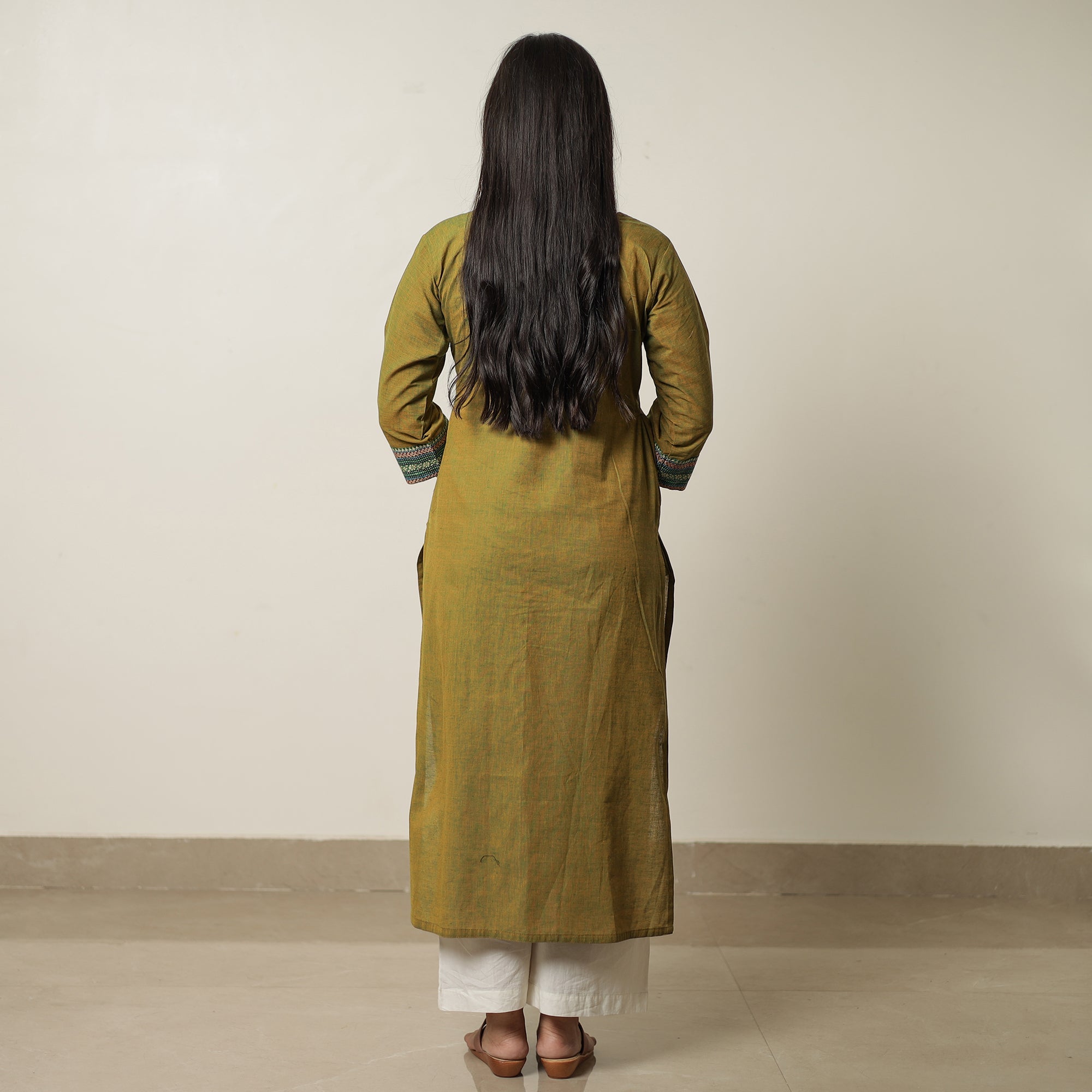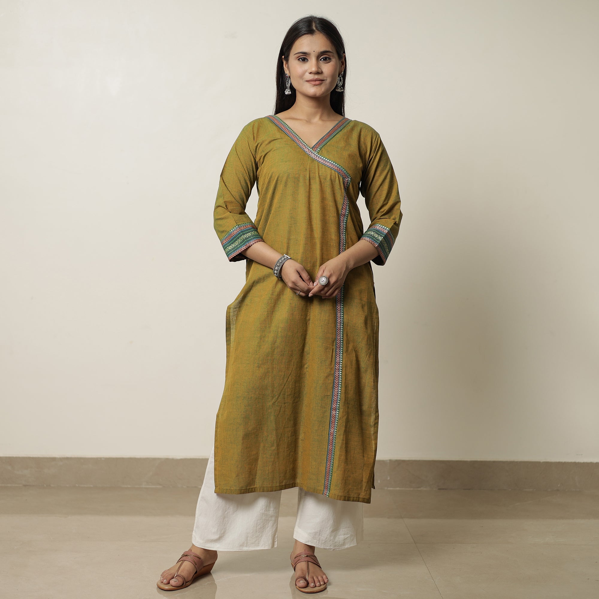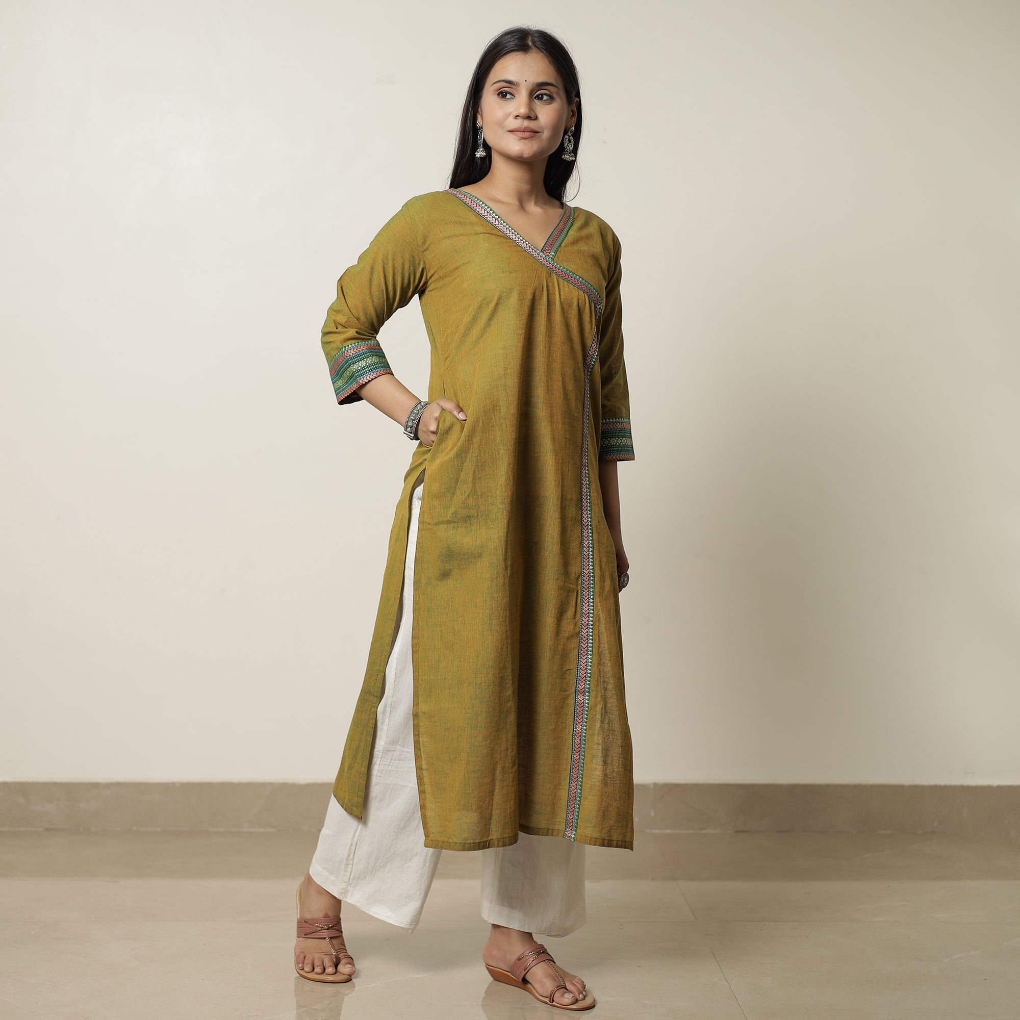 Look and feel beautiful in this uniquely designed Dharwad cotton straight long kurta. This exquisite kurta is crafted from fine-quality cotton fabric, ensuring a comfortable feel against your skin. It boasts exquisite dharwad border designs on the neck and sleeve, adding a touch of elegance to your ensemble. The kurta also features a convenient one-side pocket, perfect for carrying small essentials. This cotton kurta makes you comfortable all day long. This kurta is perfect for your daily outing and for a special occasion.