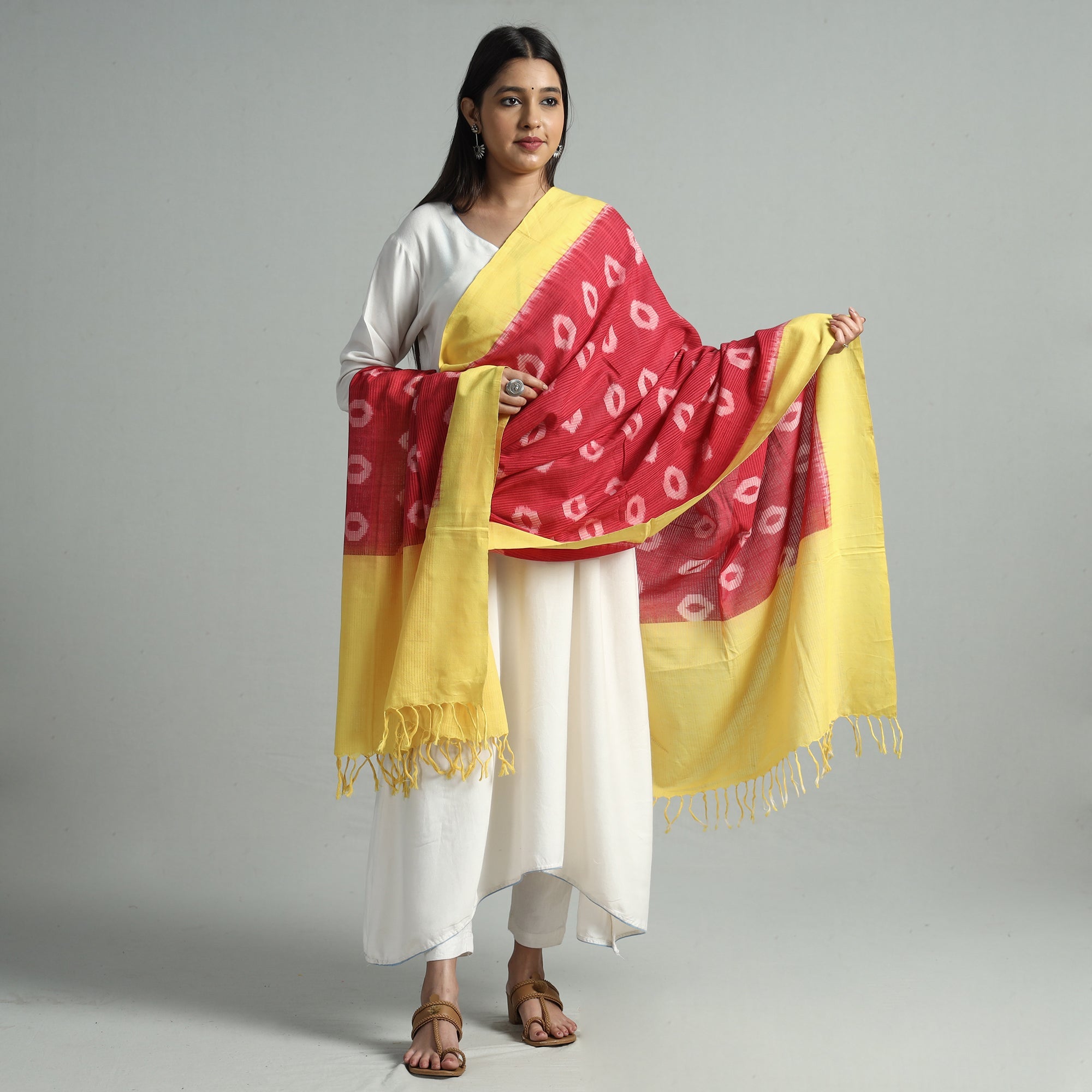 This pochampally missing ikat cotton dupatta is crafted with the finest quality handloom cotton fabric and features intricate ikat patterns created using a resist dyeing technique. The fabric is dyed using VAT dyes that do not bleed or fade easily. The dupatta comes with tassels that add to its elegance and can be paired with a range of casual outfits for a stylish look.