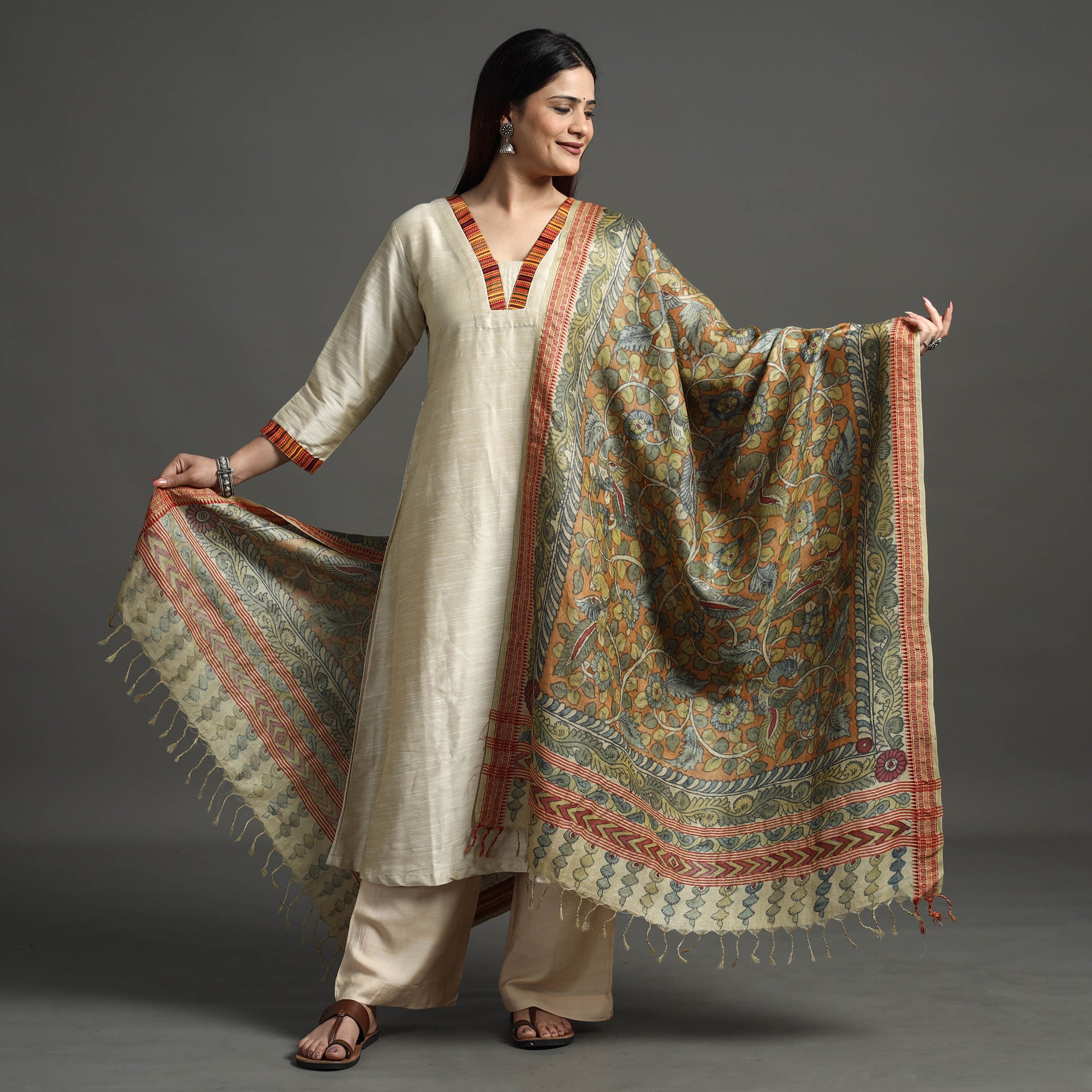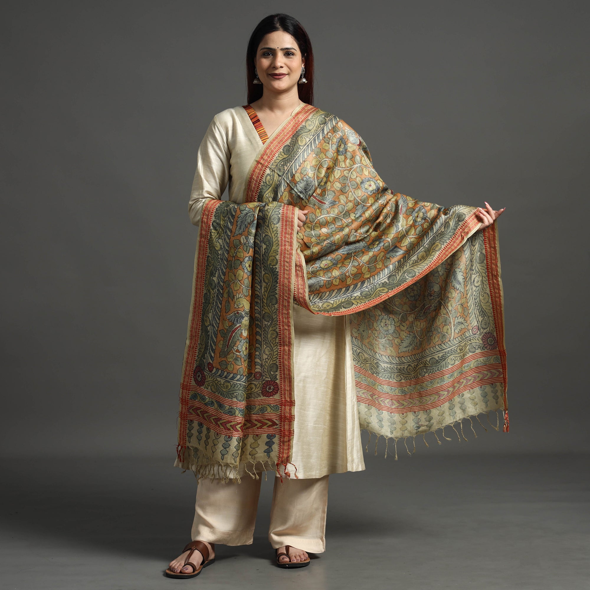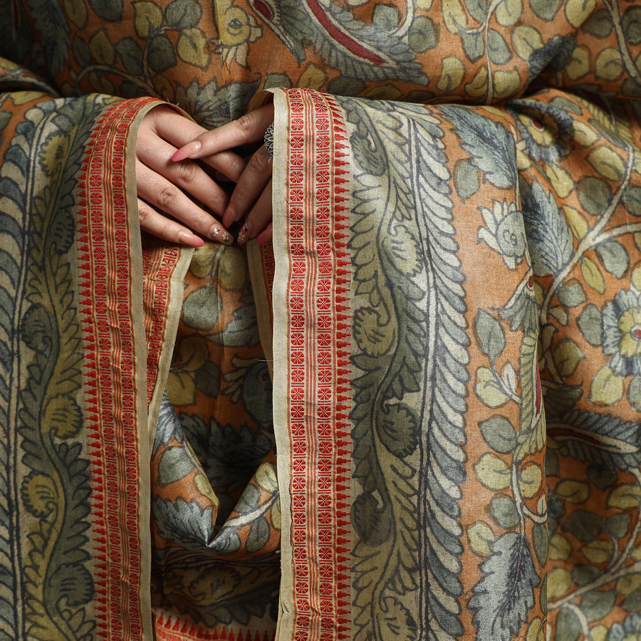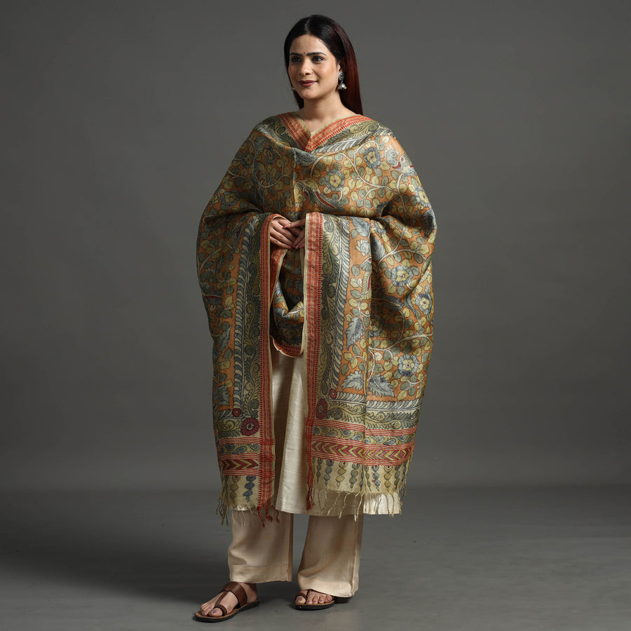 Indulge in the timeless elegance of the orange srikalahasti kalamkari penwork tussar silk dupatta with a dobby border. This exquisite creation blends the rich tradition of kalamkari, handpainted, with the luxurious allure of tussar silk. Handcrafted by skilled artisans, this dupatta showcases intricate Kalamkari motifs that narrate stories of ancient artistry. The silk's rustic charm and unique texture make it an ideal selection for enhancing elegance at formal gatherings and festive occasions, ensuring you stand out with cultural sophistication.