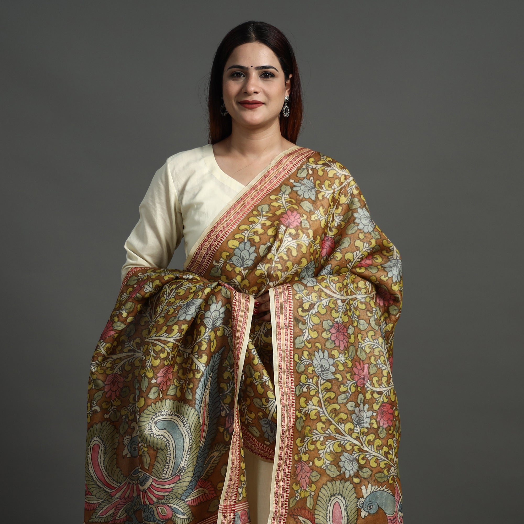 Indulge in the timeless elegance of the brown srikalahasti kalamkari penwork tussar silk dupatta with a dobby border. This exquisite creation blends the rich tradition of kalamkari, handpainted, with the luxurious allure of tussar silk. Handcrafted by skilled artisans, this dupatta showcases intricate Kalamkari motifs that narrate stories of ancient artistry. The silk's rustic charm and unique texture make it an ideal selection for enhancing elegance at formal gatherings and festive occasions, ensuring you stand out with cultural sophistication.