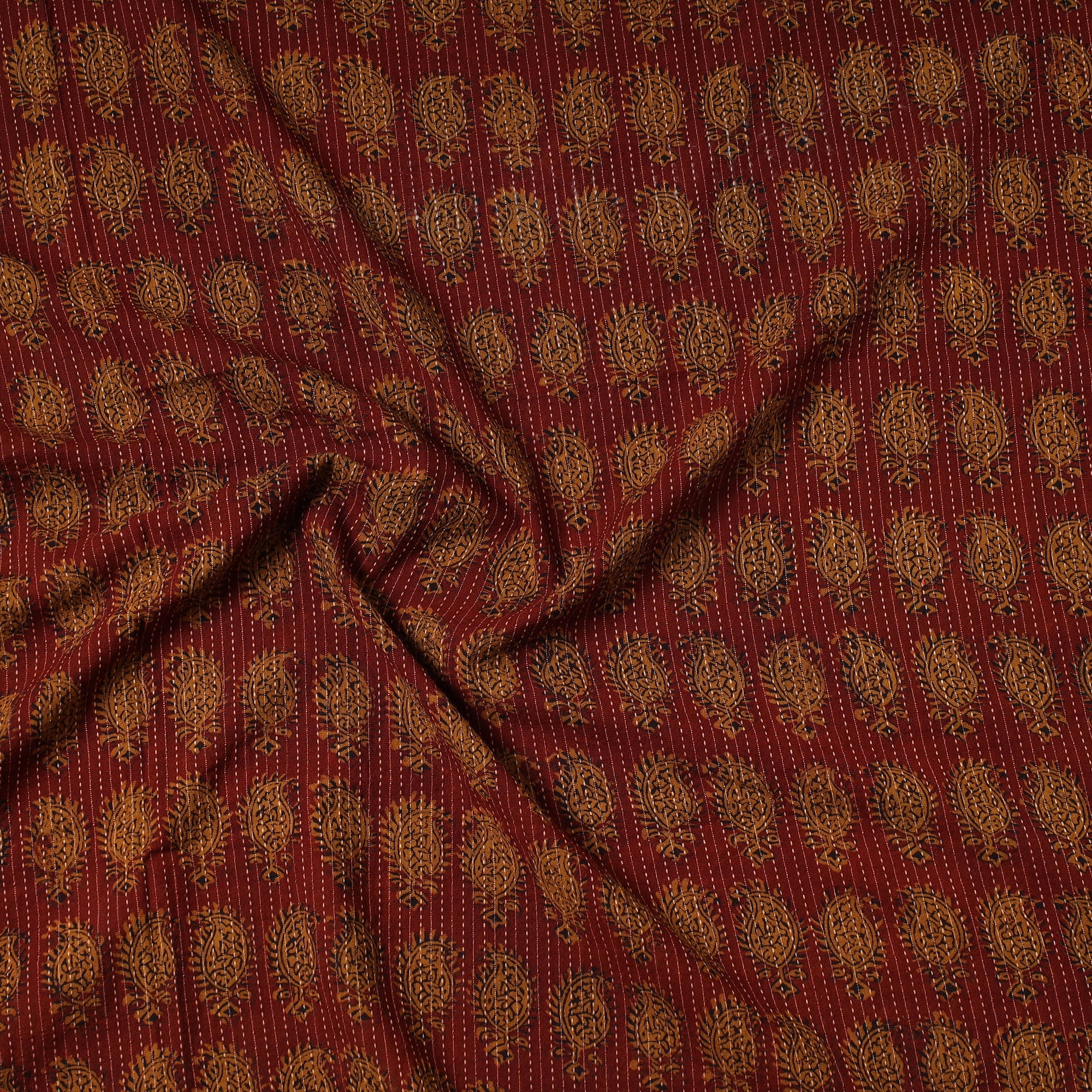 | Material | Fine quality red bagh block printed kantha style cotton precut fabric made using natural dyes through traditional processes by master artisan Umar Faruk Khatri, practiced in Bagh, the Dhar district of Madhya Pradesh. Perfect for crafting elegant blouses, bags, decorative items, etc., this exquisite textile symbolizes timeless sophistication, adding a touch of elegance to any wardrobe. |