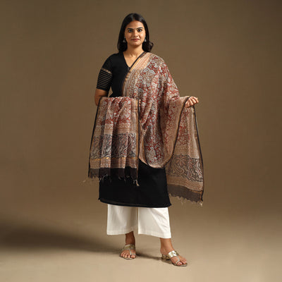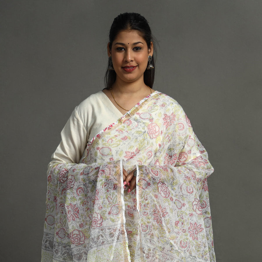 Fine quality sanganeri block printed kota doria cotton zari border dupatta with tassels made using Bleed free VAT dyes. Sanganeri is a hand-block printed technique originating from Sanganer, a village in the southern part of Jaipur, Rajasthan. Kota doria is an age-old Indian textile produced in the Kota district of Rajasthan. The Doria or the threads are finely interweaves to make the check patterns. Its lightweight and sheer texture giving an exquisite grace and elegance of its own.
