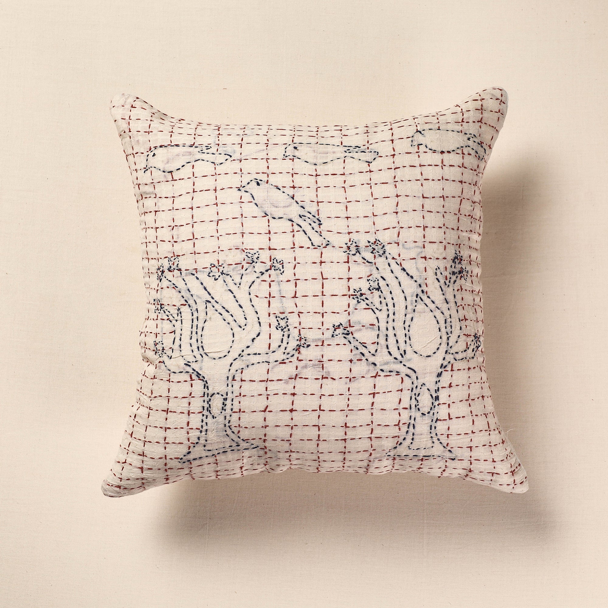 This cotton cushion cover showcases the exquisite artistry of kantha tagai, a traditional hand embroidery technique. Adorned with contemporary patterns, it is meticulously crafted using thread yarns. This piece combines the charm of traditional craftsmanship with a modern aesthetic, making it a stylish addition to any home decor.