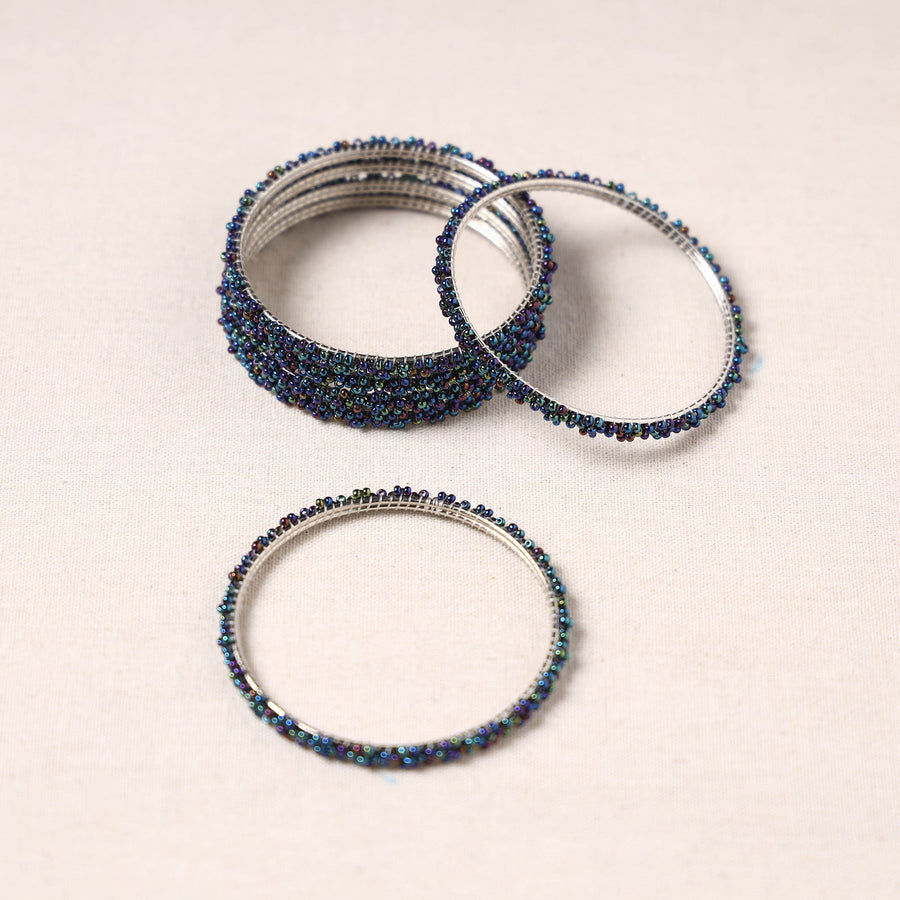 Handcrafted by the talented women of Aaghaz in Hapur, these stunning blue flower beadwork bangles feature intricate designs made with glass beads and metal bases. Each flower is meticulously crafted using six small beads and a needle, then delicately tied onto the bangle. Perfect for adding a touch of traditional elegance to any attire.