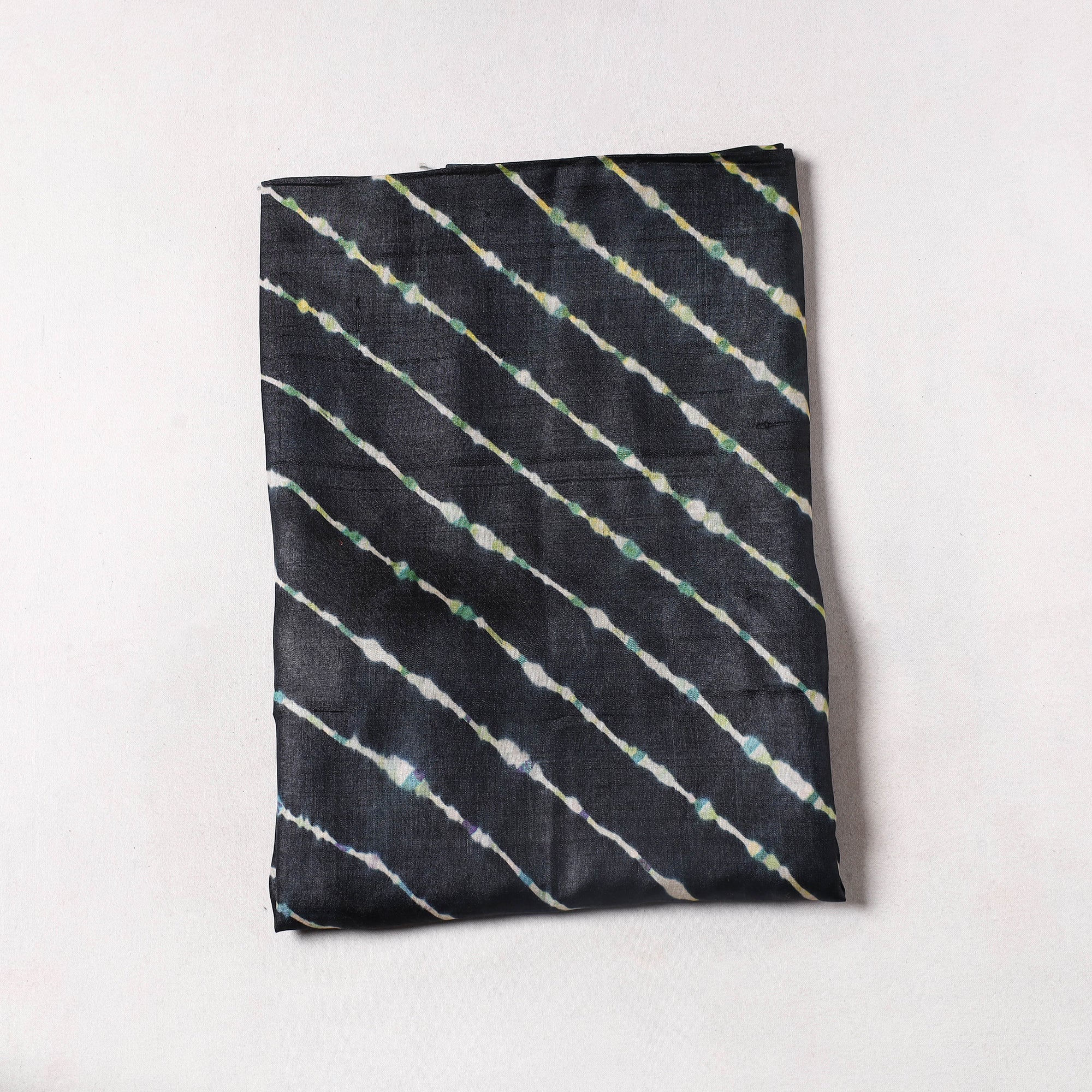 Fine quality black leheriya tie-dye pure tussar silk precut fabric. Azo free dye has been used to make this fabric. The wavy patterns on this fabric have been dyed using leheriya tie & dye technique through a traditional process by the master artisan family of Badshah Miyan from the state of Rajasthan. Perfect for crafting elegant blouses, bags, decorative accessories and more, this exquisite fabric is the epitome of timeless sophistication, adding a touch of elegance to any wardrobe.