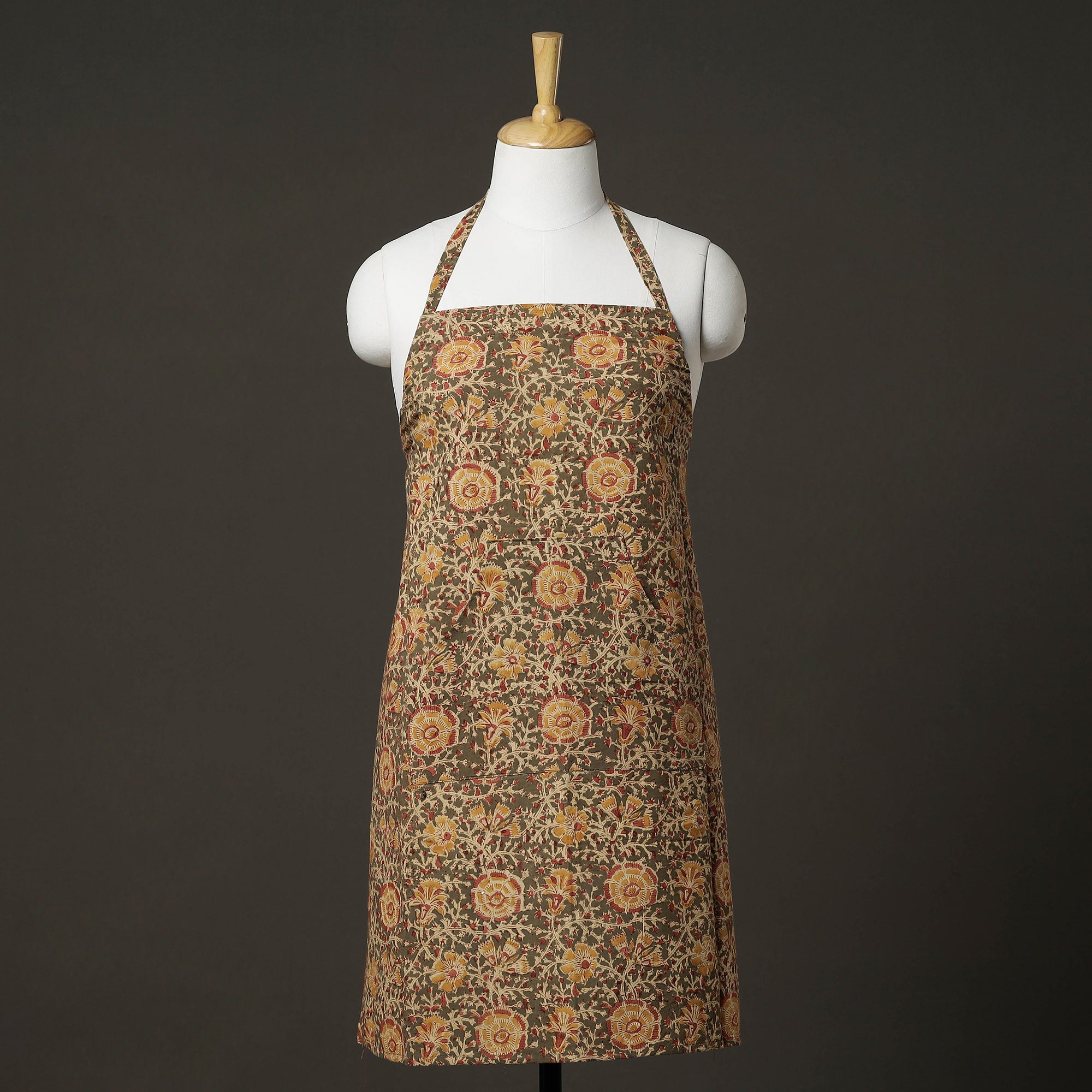 This brown kalamkari block-printed cotton apron with pocket is a versatile and stylish addition to your cooking and baking ensemble! Made from high-quality cotton material, this apron is perfect for protecting your clothing from splatters. The traditional kalamkari hand block print adds a touch of elegance and sophistication to your cooking attire, making it a great choice for both home cooks and professional chefs. With a convenient pocket at the front, this apron allows you to keep all your essential kitchen tools close at hand. Whether you need a spatula, spoon, or timer, you can easily store it in your pocket for easy access while you work. The adjustable neck strap and waist ties ensure a comfortable and secure fit for all body types, making this apron suitable for both men and women.