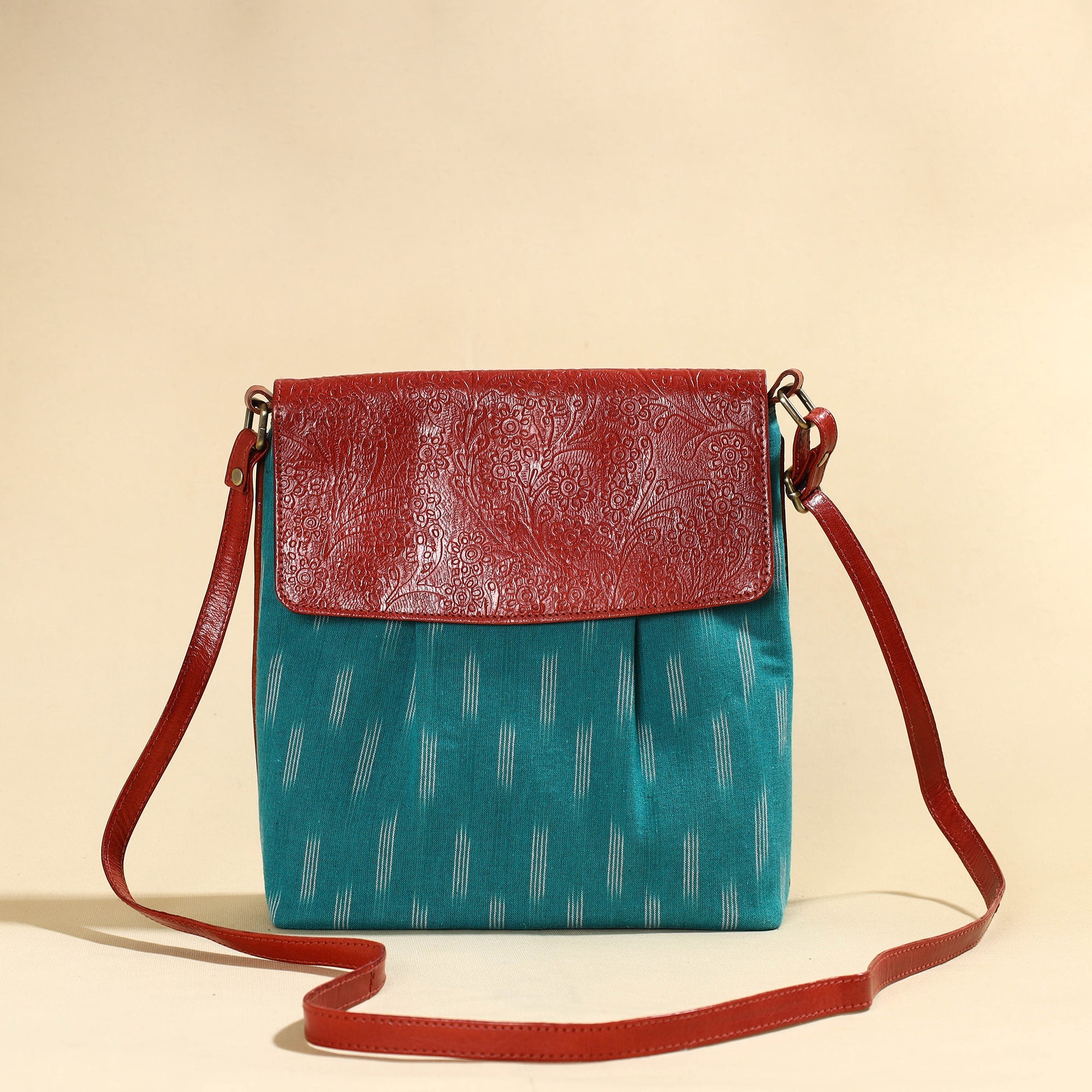 Fine-quality blue ikat cotton fabric sling bag with embossed leather flap handcrafted by the master artisans of Kolkata, West Bengal. This exquisite bag comes with an adjustable sling. Crafted with the utmost care, the vegetable-tanned, hand-painted leather flap and sling add a touch of luxury. It has ample space to keep most of your essentials, with a cotton lining inside and two interior zipper pockets. Elevate your accessory collection with this unique, handcrafted masterpiece.