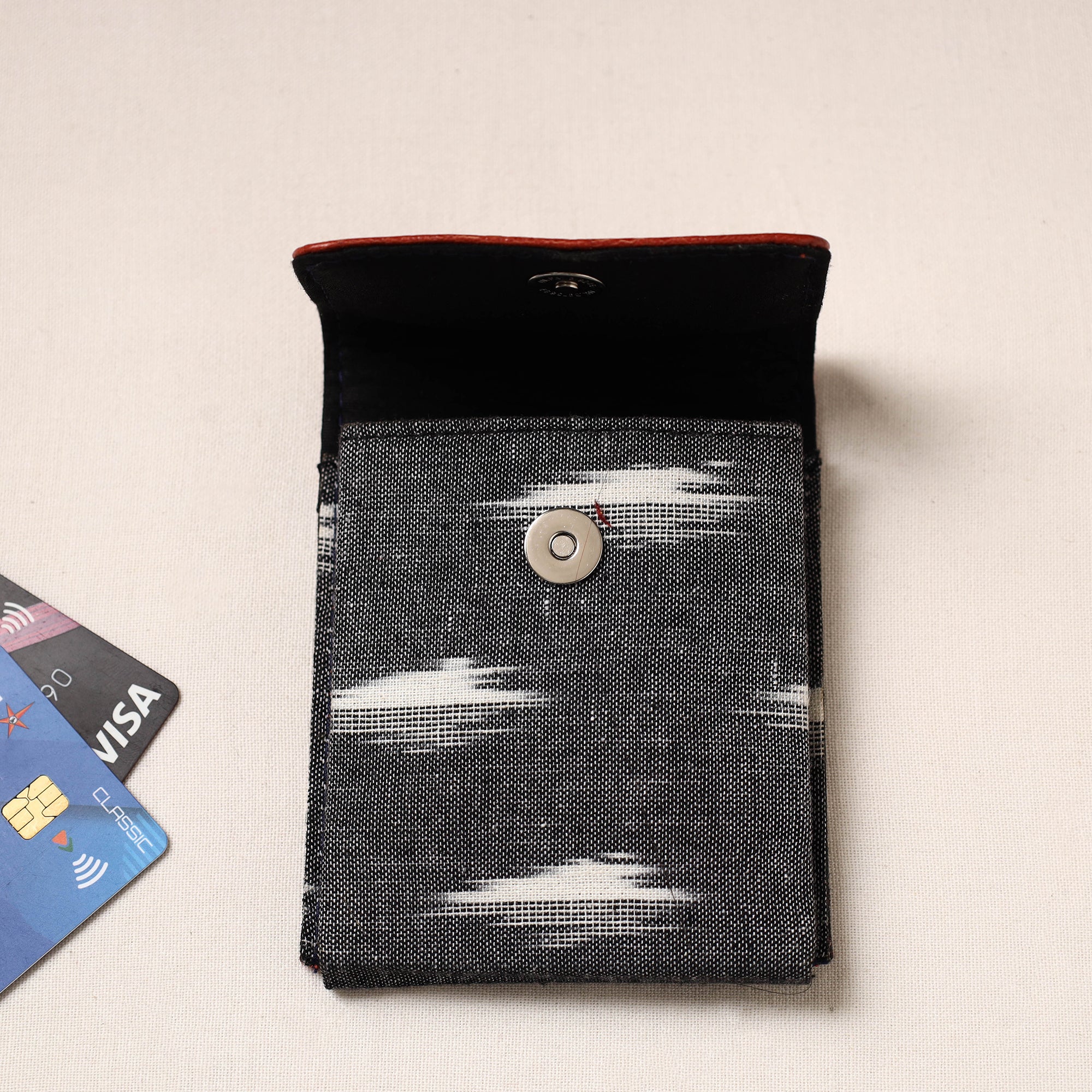 Fine-quality ikat fabric card holder with embossed leather flap Handcrafted by the master artisans of Kolkata, West Bengal. Adorned with an embossed leather flap for timeless elegance, it seamlessly blends traditional and modern elements. The exterior showcases stunning ikat fabric, adding a touch of sophistication. With three sections, it offers ample space to organize your ATM, debit, and credit cards in style, making it both functional and stylish.