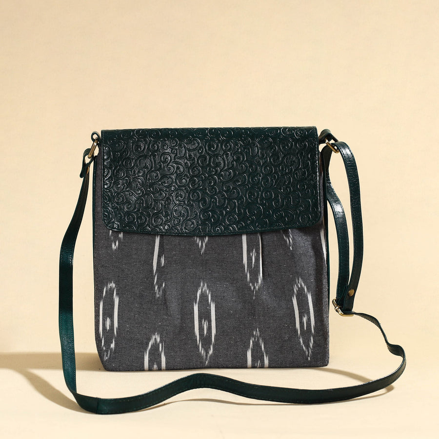 Fine-quality grey ikat cotton fabric sling bag with embossed leather flap handcrafted by the master artisans of Kolkata, West Bengal. This exquisite bag comes with an adjustable sling. Crafted with the utmost care, the vegetable-tanned, hand-painted leather flap and sling add a touch of luxury. It has ample space to keep most of your essentials, with a cotton lining inside and two interior zipper pockets. Elevate your accessory collection with this unique, handcrafted masterpiece.