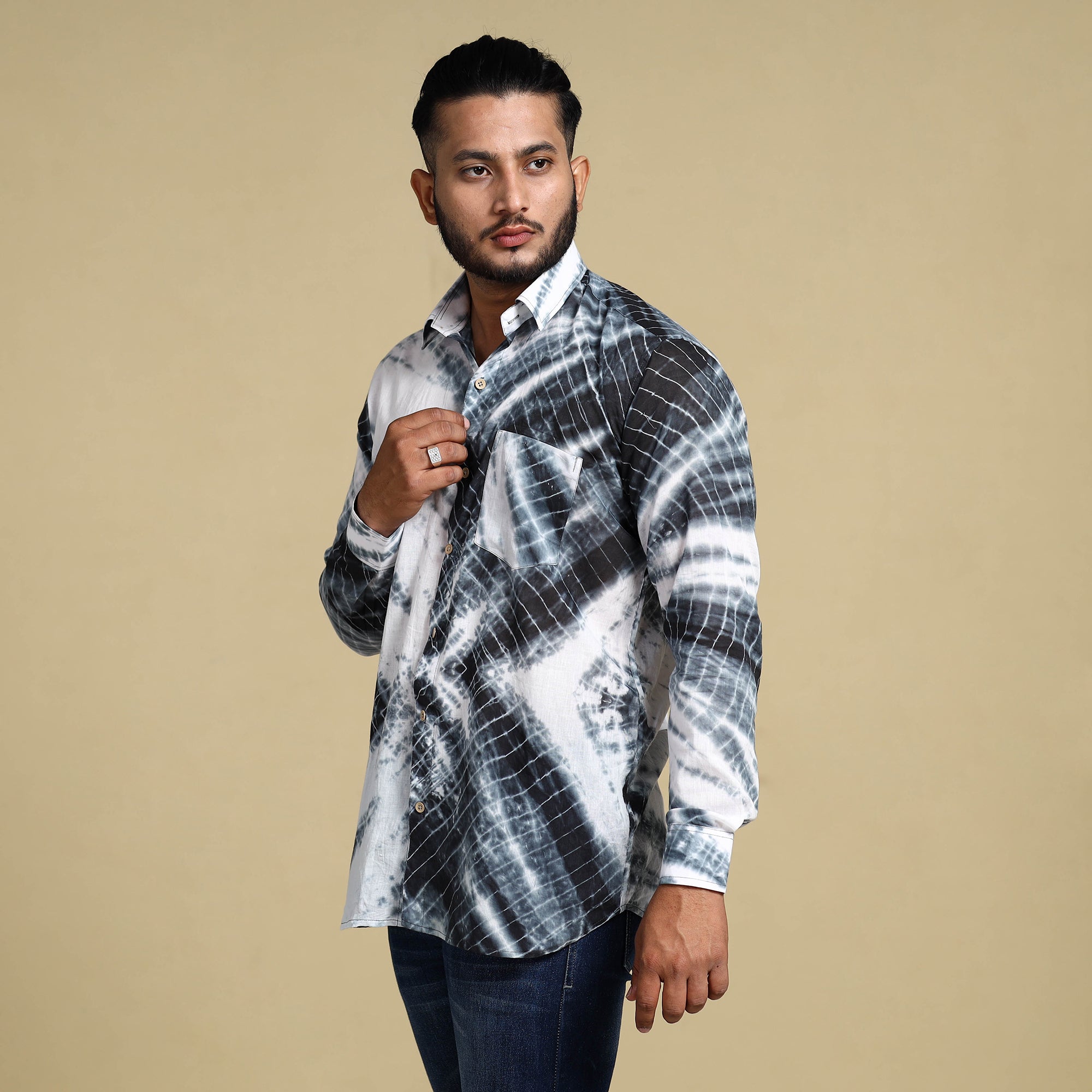 This shibori tie-dye soft cotton men's full-sleeve shirt is a perfect blend of style and comfort. It's crafted from soft and breathable cotton fabric, which ensures all-day comfort. This shirt features a regular collar and full sleeves, ideal for a casual yet sophisticated look. The crisp wooden buttons add a touch of natural charm, while the patch pocket on the front offers convenience and practicality. The process of shibori tie-dye involves tying or clamping the fabric in a specific design and then dyeing it in a vibrant color to create a beautiful and unique pattern.