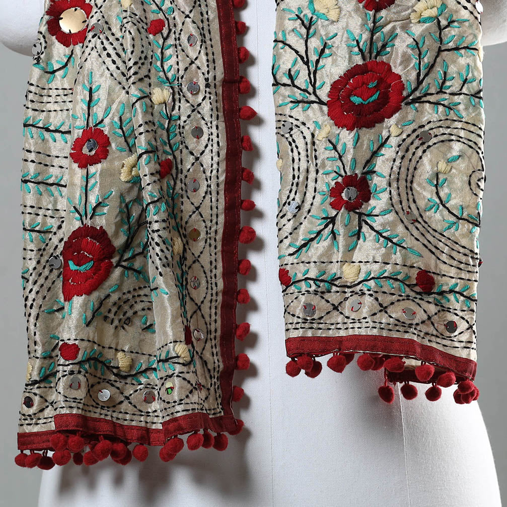 Enhance your ensemble with the maroon ranihati chapa work, embroidery chanderi silk stole with pom pom. This beautiful stole is designed with traditional patterns and has been hand-embroidered by skilled craftspeople from Ranihati, Howrah, West Bengal.