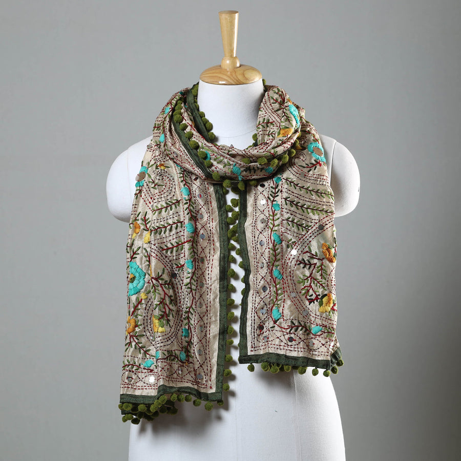 Enhance your ensemble with the green ranihati chapa work, embroidery chanderi silk stole with pom pom. This beautiful stole is designed with traditional patterns and has been hand-embroidered by skilled craftspeople from Ranihati, Howrah, West Bengal.