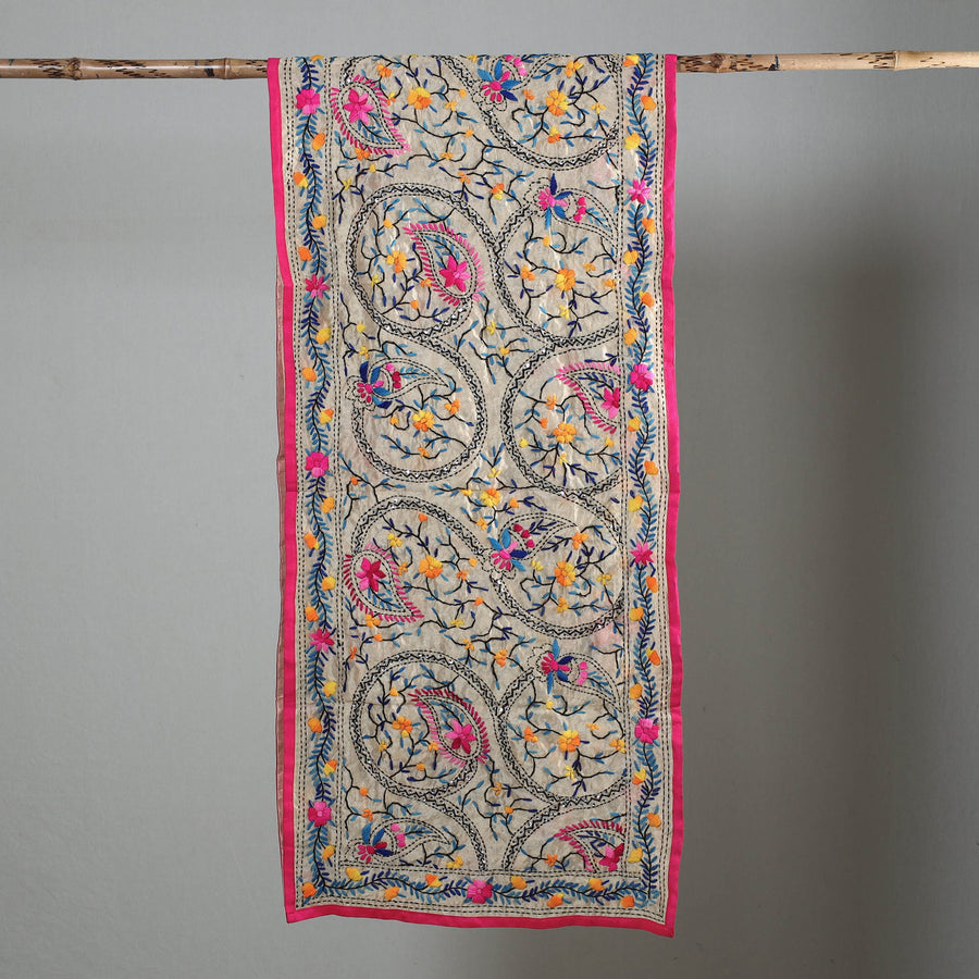 Enhance your ensemble with the pink ranihati chapa work embroidery chanderi silk stole. This beautiful stole is designed with traditional patterns and has been hand-embroidered by skilled craftspeople from Ranihati, Howrah, West Bengal.