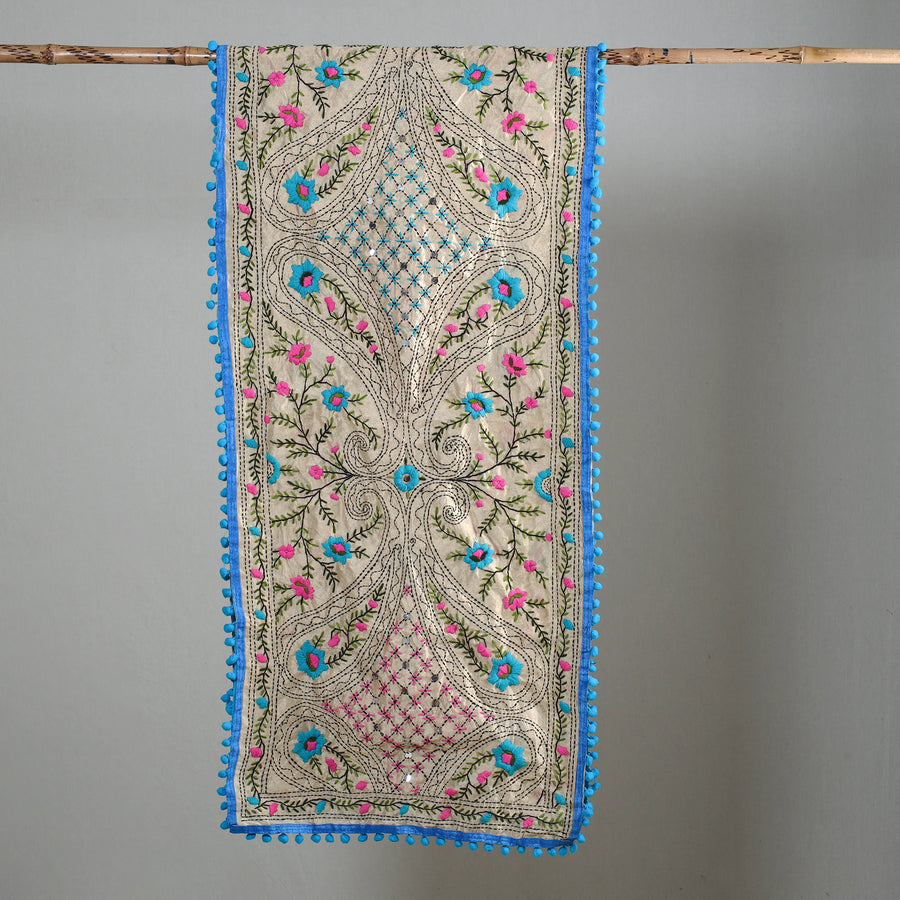 Enhance your ensemble with the blue ranihati chapa work embroidery chanderi silk stole with pom pom. This beautiful stole is designed with traditional patterns and has been hand-embroidered by skilled craftspeople from Ranihati, Howrah, West Bengal.