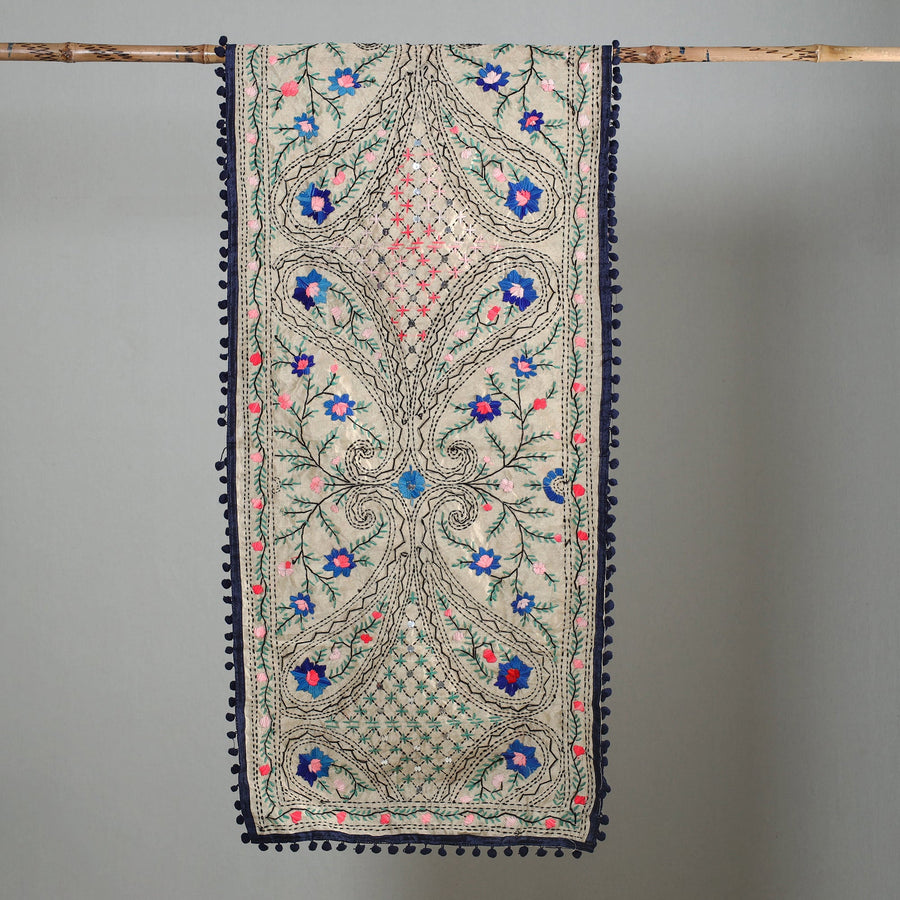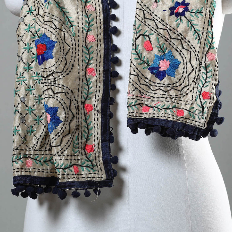 Enhance your ensemble with the blue ranihati chapa work, embroidery chanderi silk stole with pom pom. This beautiful stole is designed with traditional patterns and has been hand-embroidered by skilled craftspeople from Ranihati, Howrah, West Bengal.