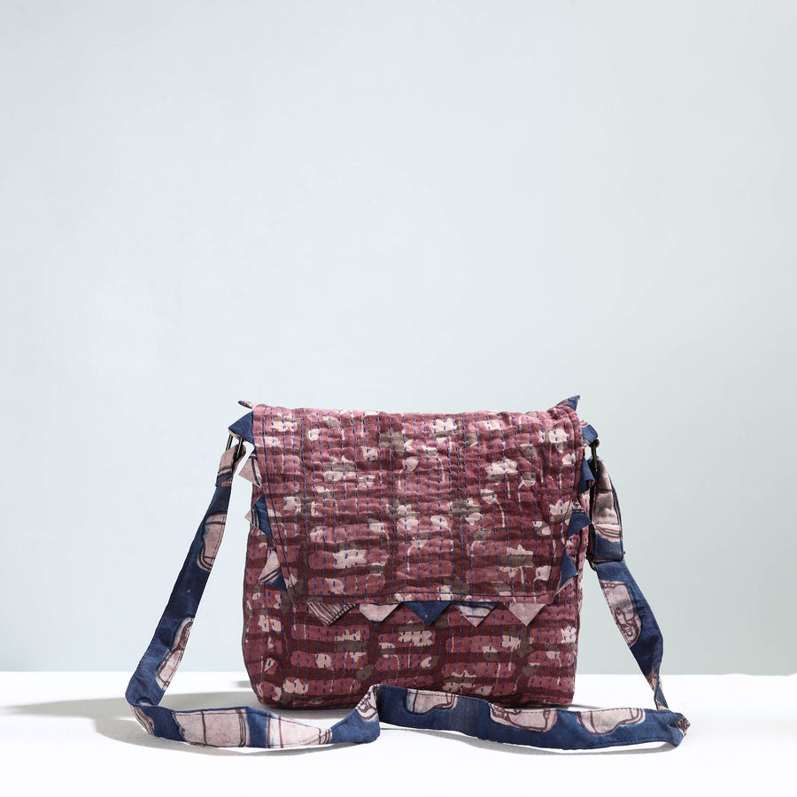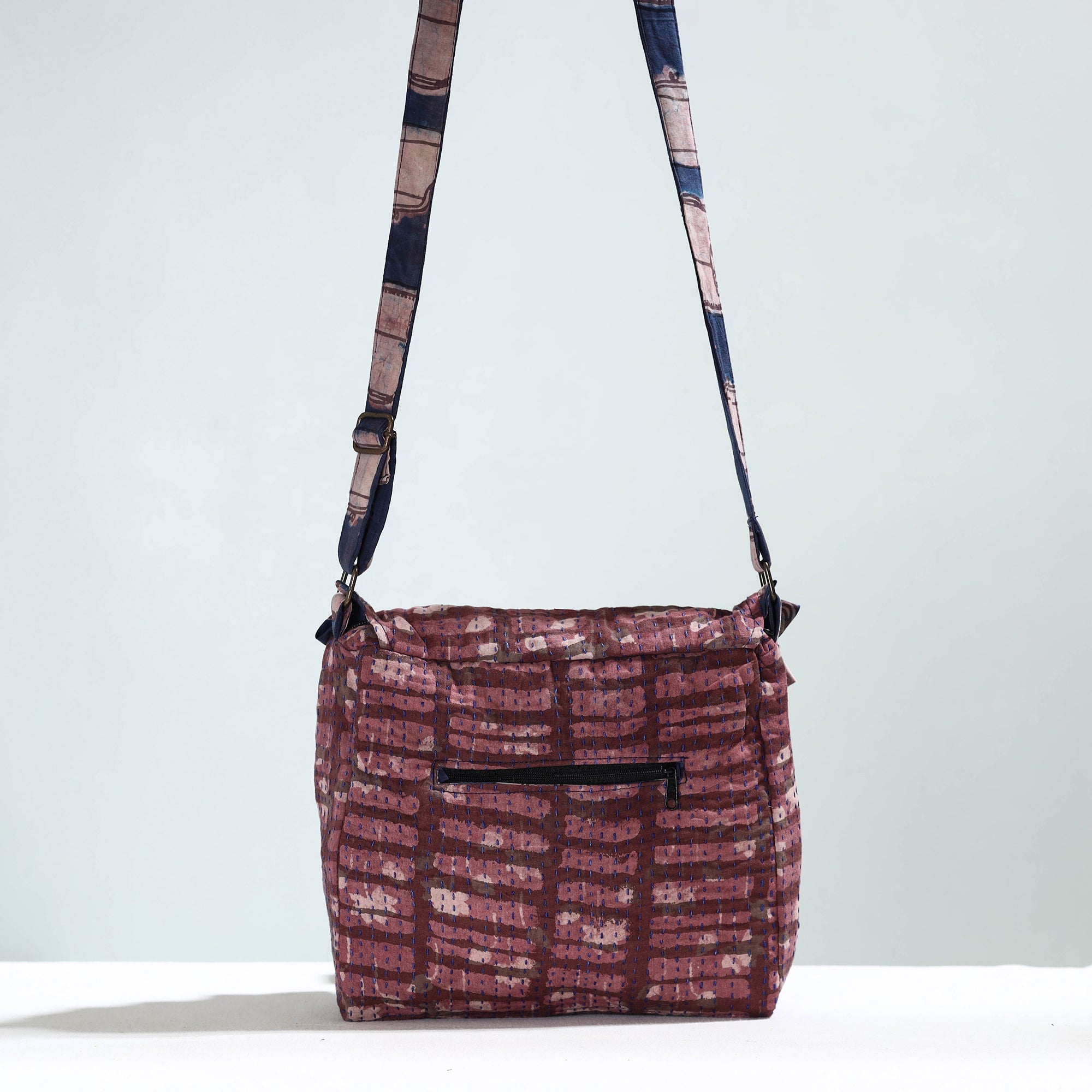 This brown handmade running stitch cotton flap sling bag by Jugaad. It's skillfully crafted from block-printed, running-stitch cotton fabric. The bag features an adjustable sling for customizable comfort. It has one simple pocket inside and one zipper pocket outside, and it has enough space to keep most of your essentials. Elevate your style while relishing the practicality of this unique artisanal creation.