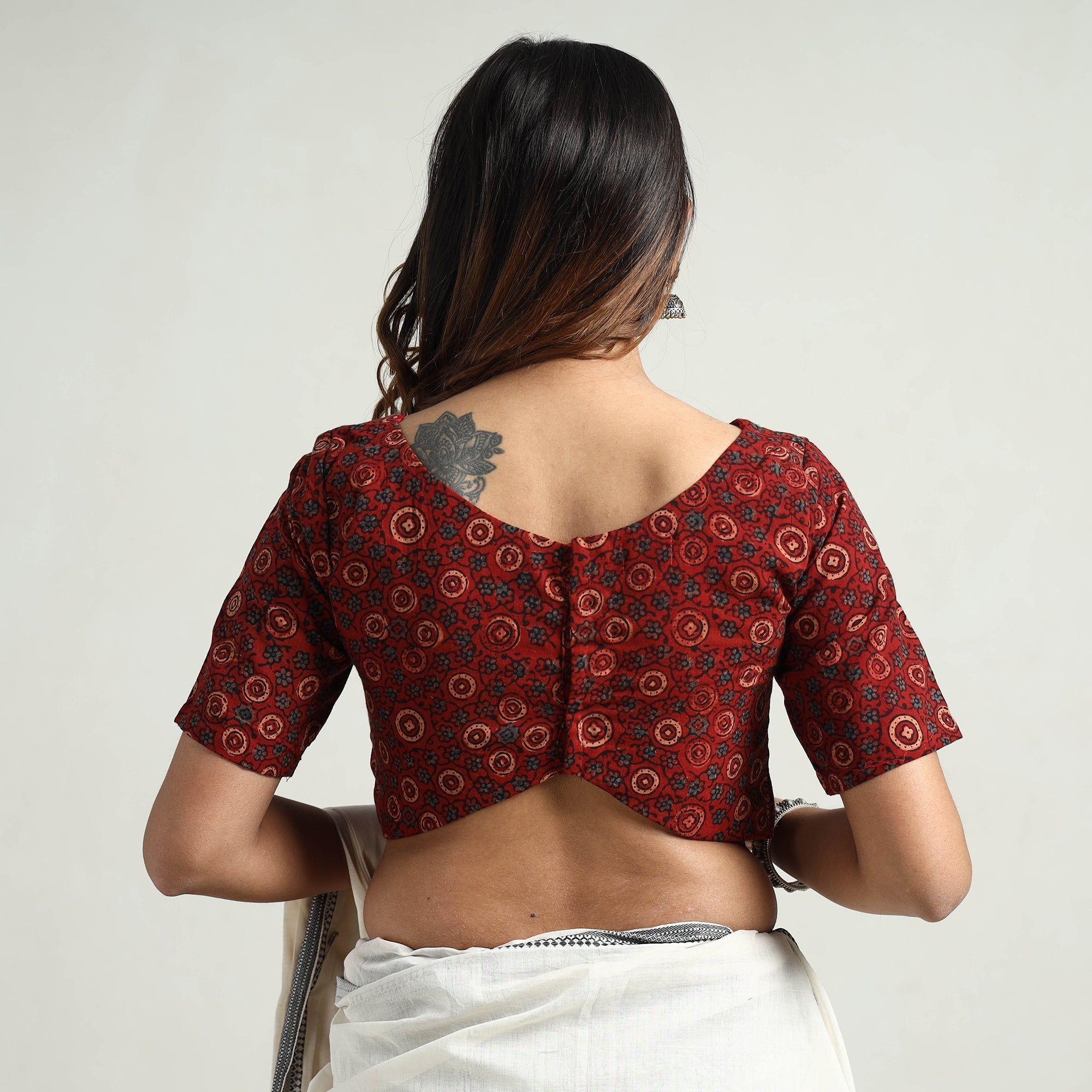 This ajrakh block-printed cotton blouse is seamlessly stitched with padded comfort for a relaxed fit. Crafted from cotton fabric known for its breathability and comfort, it features half sleeves that provide balanced coverage, making it perfect for any occasion. The hook lock adds convenience and allows for easy wear and removal. With its intricate block-printed motifs, this blouse adds a touch of cultural charm to your outfit.