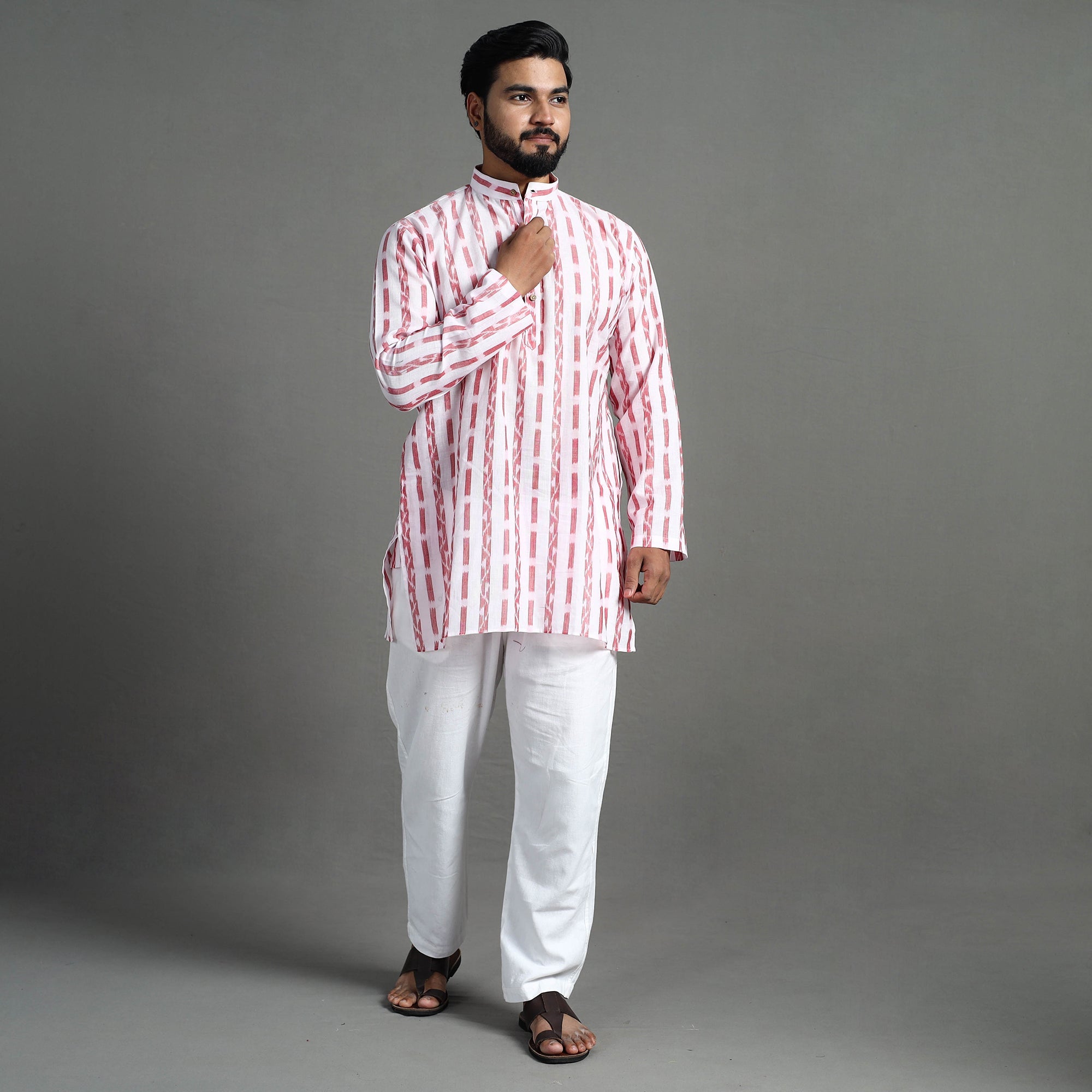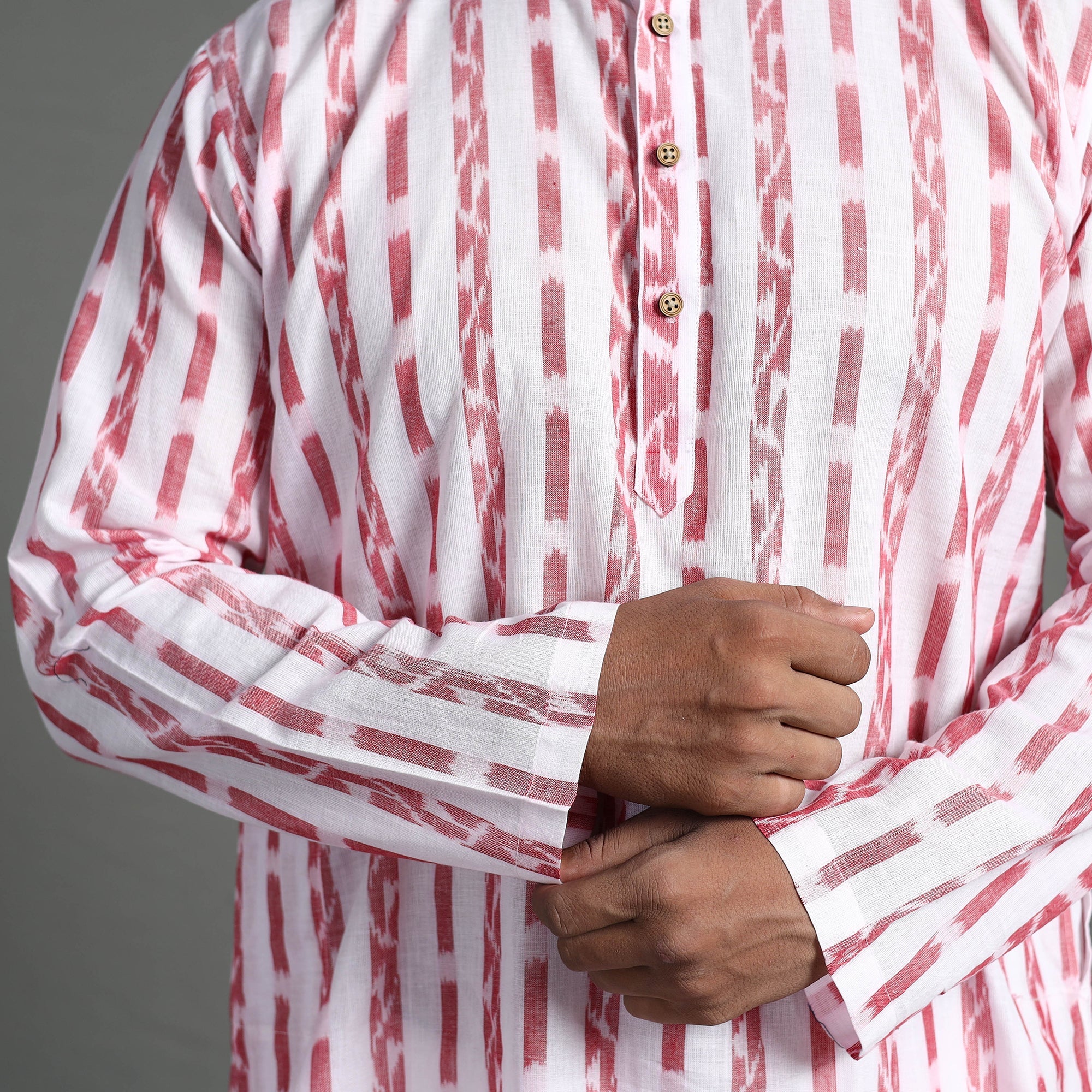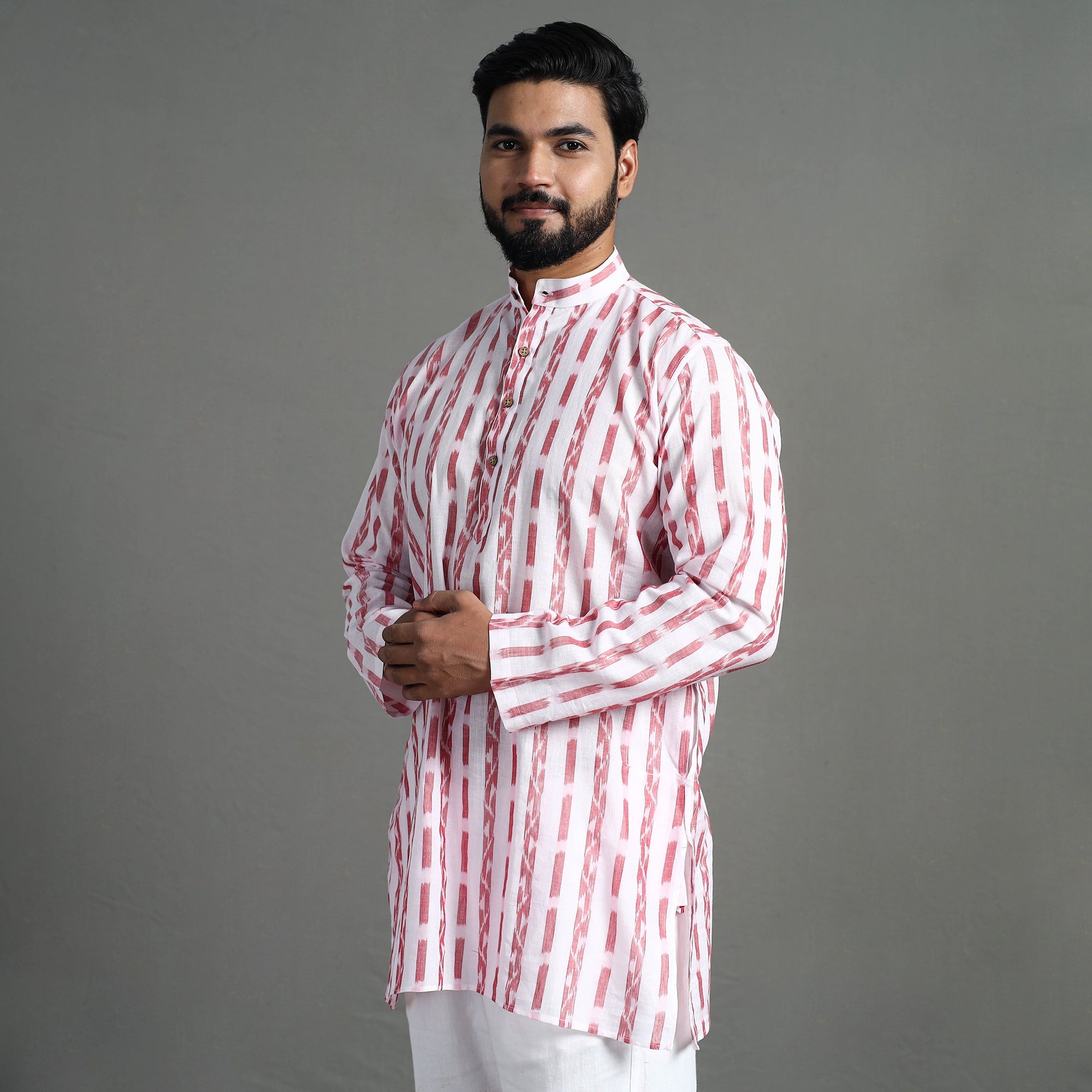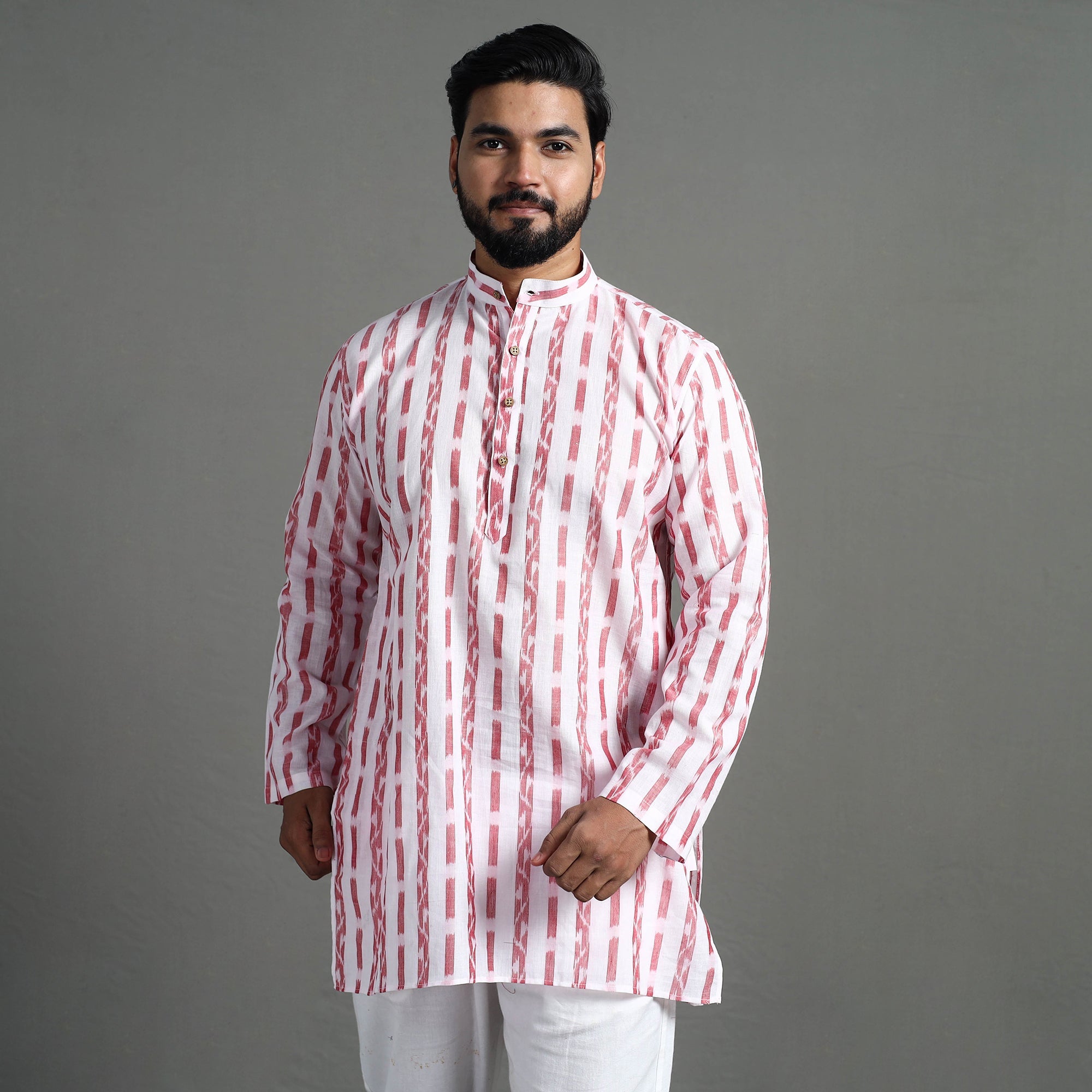 Enhance your style with our exquisite sambalpuri ikat weave cotton men's short kurta. Made from authentic sambalpuri ikat cotton fabric, this casual yet elegant kurta Ideal for daily outings or special occasions, this kurta blends style and comfort effortlessly. It features full sleeves, a front button placket with a chinese collar, and two side pockets convenient for your daily essentials.