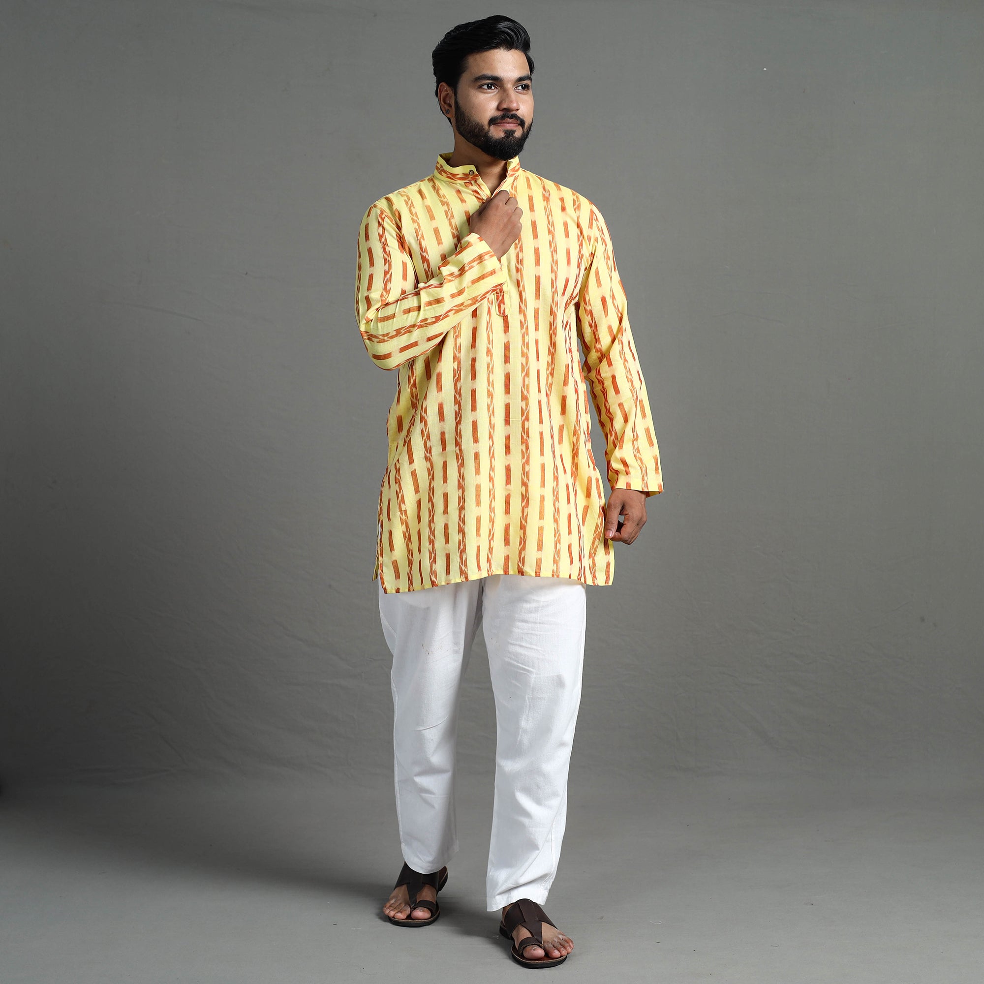 Enhance your style with our exquisite sambalpuri ikat weave cotton men's short kurta. Made from authentic sambalpuri ikat cotton fabric, this casual yet elegant kurta Ideal for daily outings or special occasions, this kurta blends style and comfort effortlessly. It features full sleeves, a front button placket with a chinese collar, and two side pockets convenient for your daily essentials.
