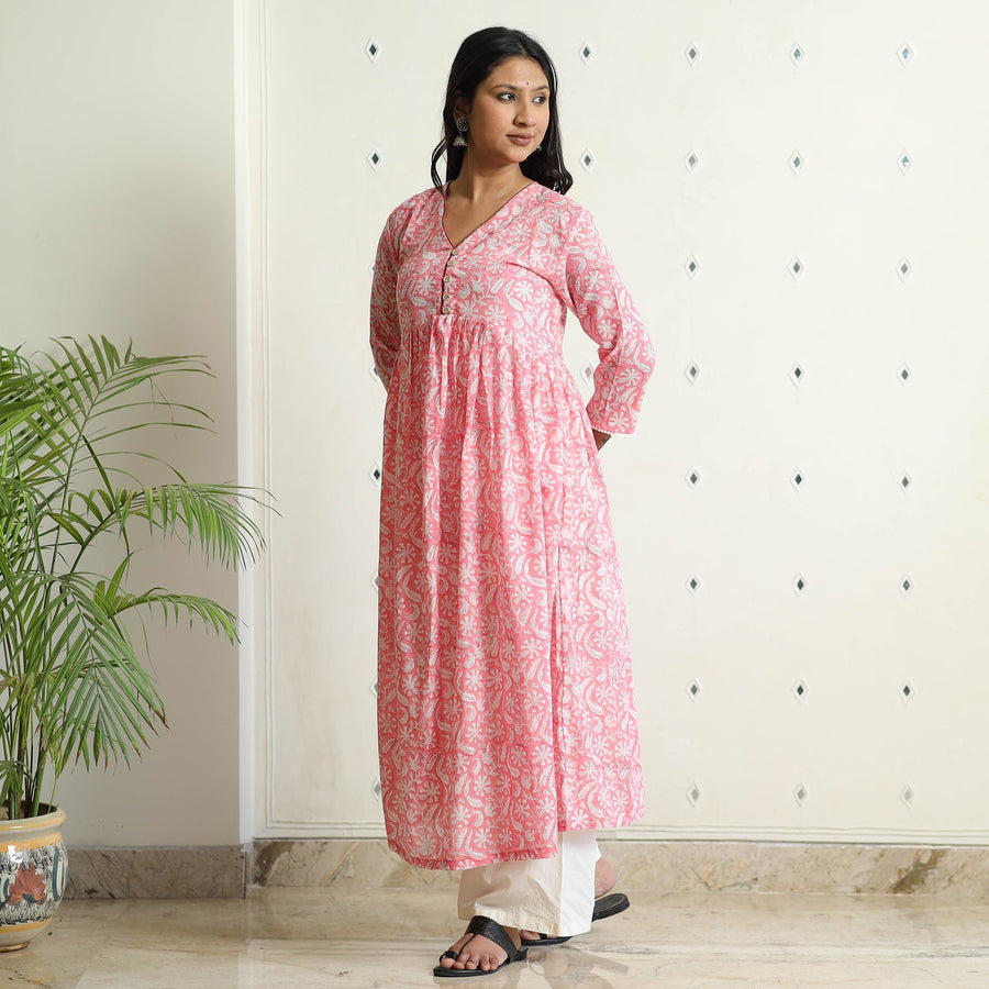 Pink - Sanganeri Block Printed Mul Cotton A-Line Kurta