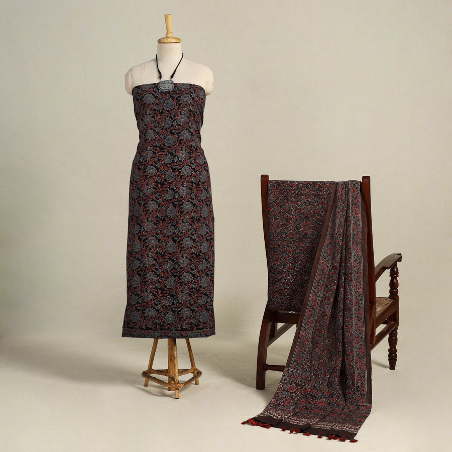 Fine quality black ajrakh hand-block-printed cotton 3-piece suit material set from Kutch. This exquisite set is handcrafted with the utmost care and skill, showcasing the traditional ajrakh technique of hand block printing practiced by the skilled artisans in the kutch region of Gujarat. Each piece is made using natural dyes, reflecting the rich heritage of ajrakh and adding a touch of eco-friendliness to your attire. The intricate patterns and vibrant colors on the cotton fabric create a perfect blend of elegance and comfort, making it ideal for any special occasion.