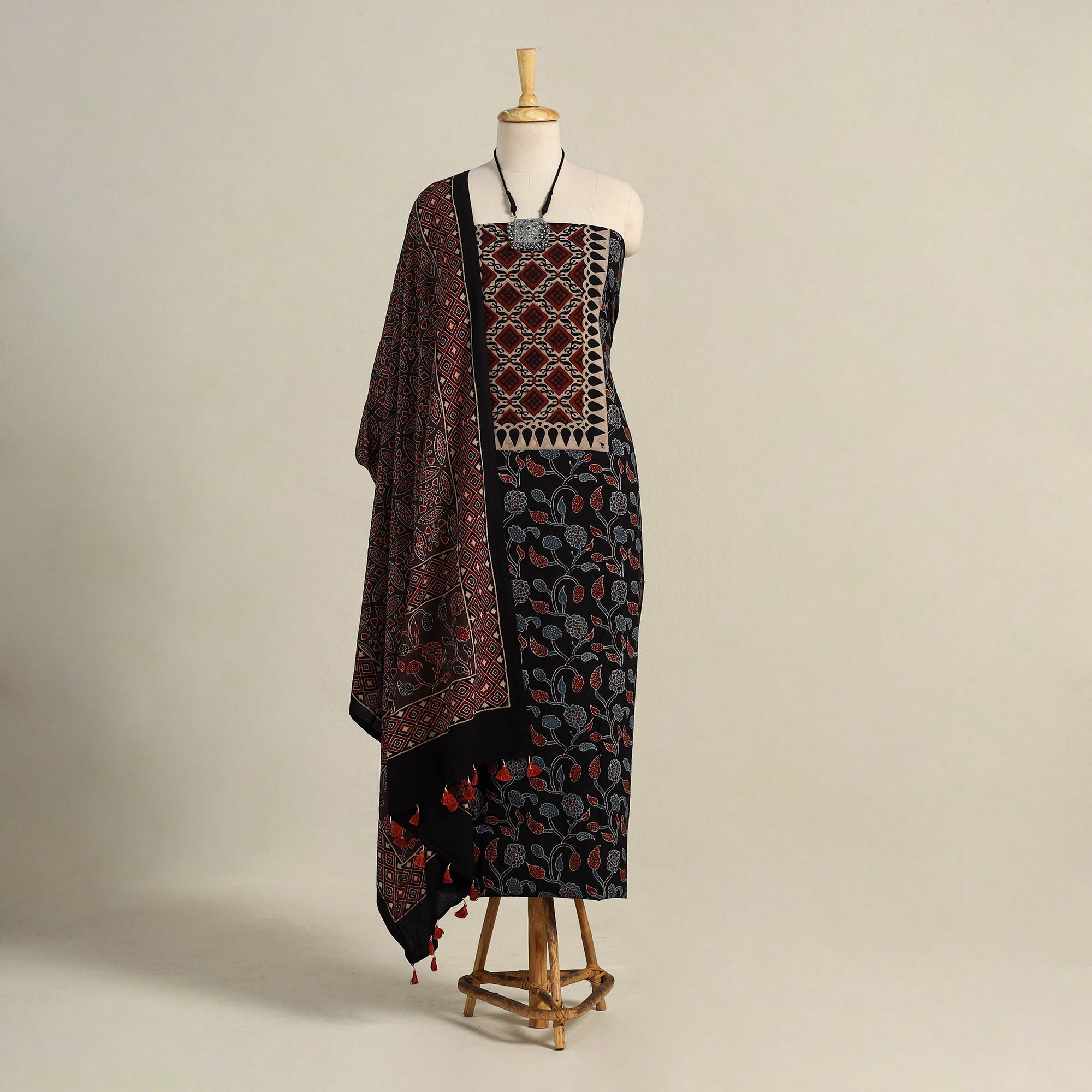 Fine quality black ajrakh hand-block-printed cotton 3-piece suit material set from Kutch. This exquisite set is handcrafted with the utmost care and skill, showcasing the traditional ajrakh technique of hand block printing practiced by the skilled artisans in the kutch region of Gujarat. Each piece is made using natural dyes, reflecting the rich heritage of ajrakh and adding a touch of eco-friendliness to your attire. The intricate patterns and vibrant colors on the cotton fabric create a perfect blend of elegance and comfort, making it ideal for any special occasion.