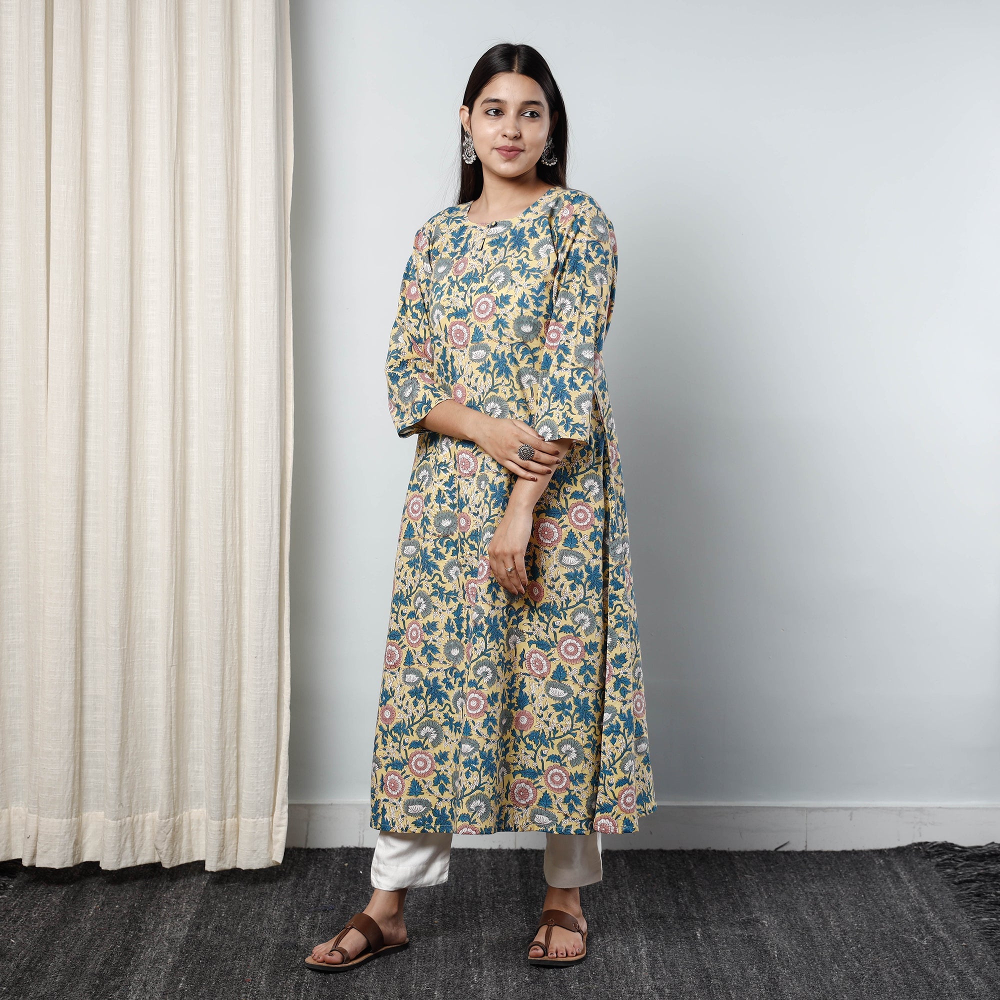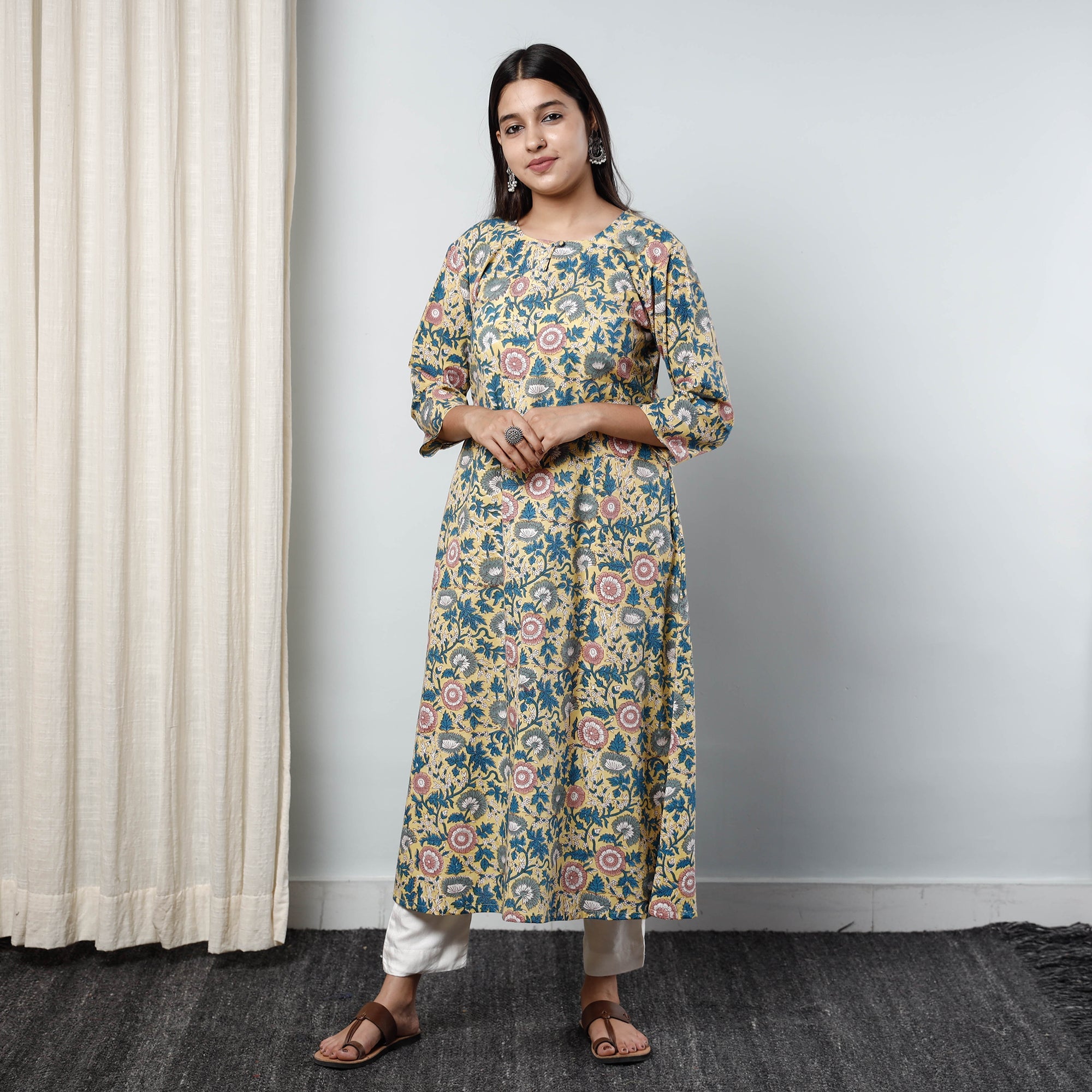 Look effortlessly elegant in this sanganeri block print A-line kurta. Crafted from soft cotton, it features delicate floral motifs inspired by the traditional craft of Sanganer, Rajasthan. Designed for a relaxed fit with a practical side pocket, it’s ideal for both casual outings and intimate gatherings. Add a touch of timeless charm to your everyday wardrobe with this graceful kurta.