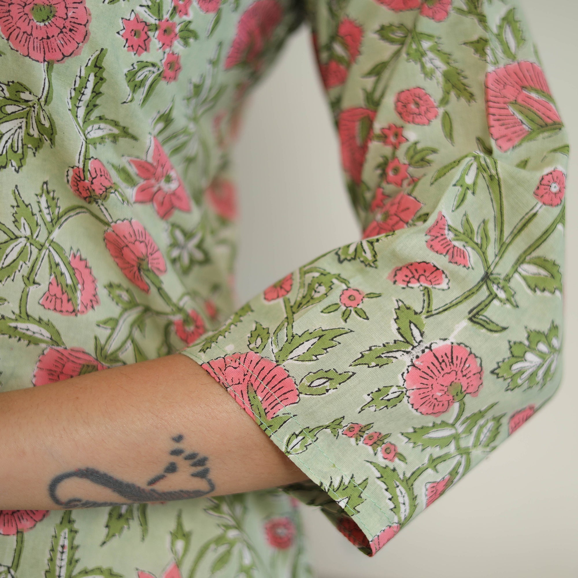 Fine quality block print cotton a-line green sanganeri kurta with side pocket. Look and feel beautiful in this uniquely designed cotton long kurta. This cotton kurta makes you comfortable with ease all day long. This kurta is perfect for your daily outing and for a special occasion.