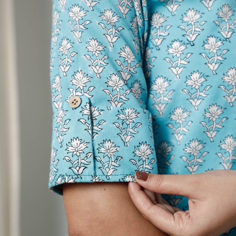 Look and feel beautiful in this uniquely designed sanganeri block printed cotton long kurta with one side pocket. This cotton kurta makes you comfortable with ease all day long. Sanganeri is a hand-block printing technique originating from Sanganer, a village in the southern part of Jaipur, Rajasthan. Bleed free VAT dyes used.