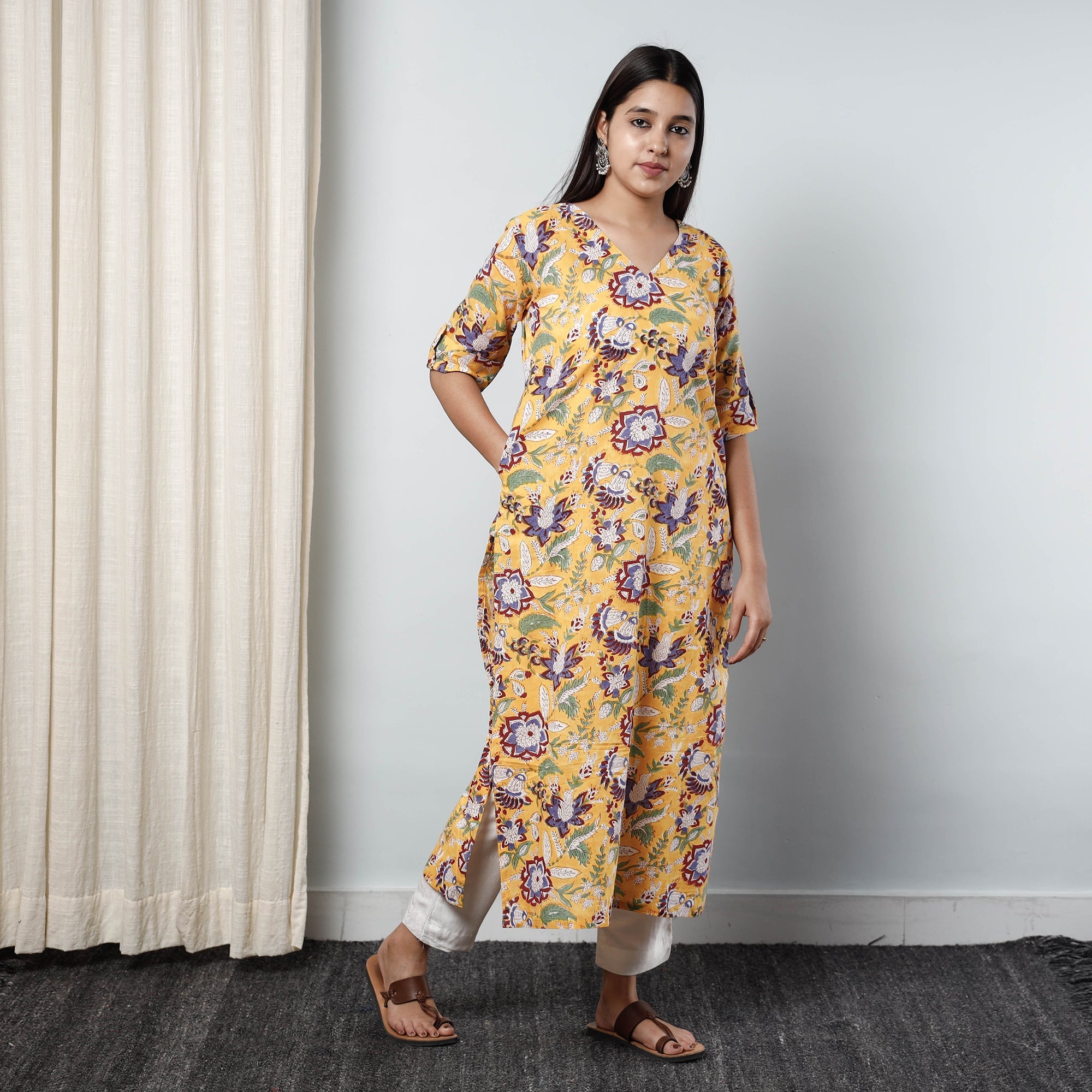 Look and feel beautiful in this uniquely designed sanganeri block printed cotton long kurta with one side pocket. This cotton kurta makes you comfortable with ease all day long. Sanganeri is a hand-block printing technique originating from Sanganer, a village in the southern part of Jaipur, Rajasthan. Bleed free VAT dyes used.