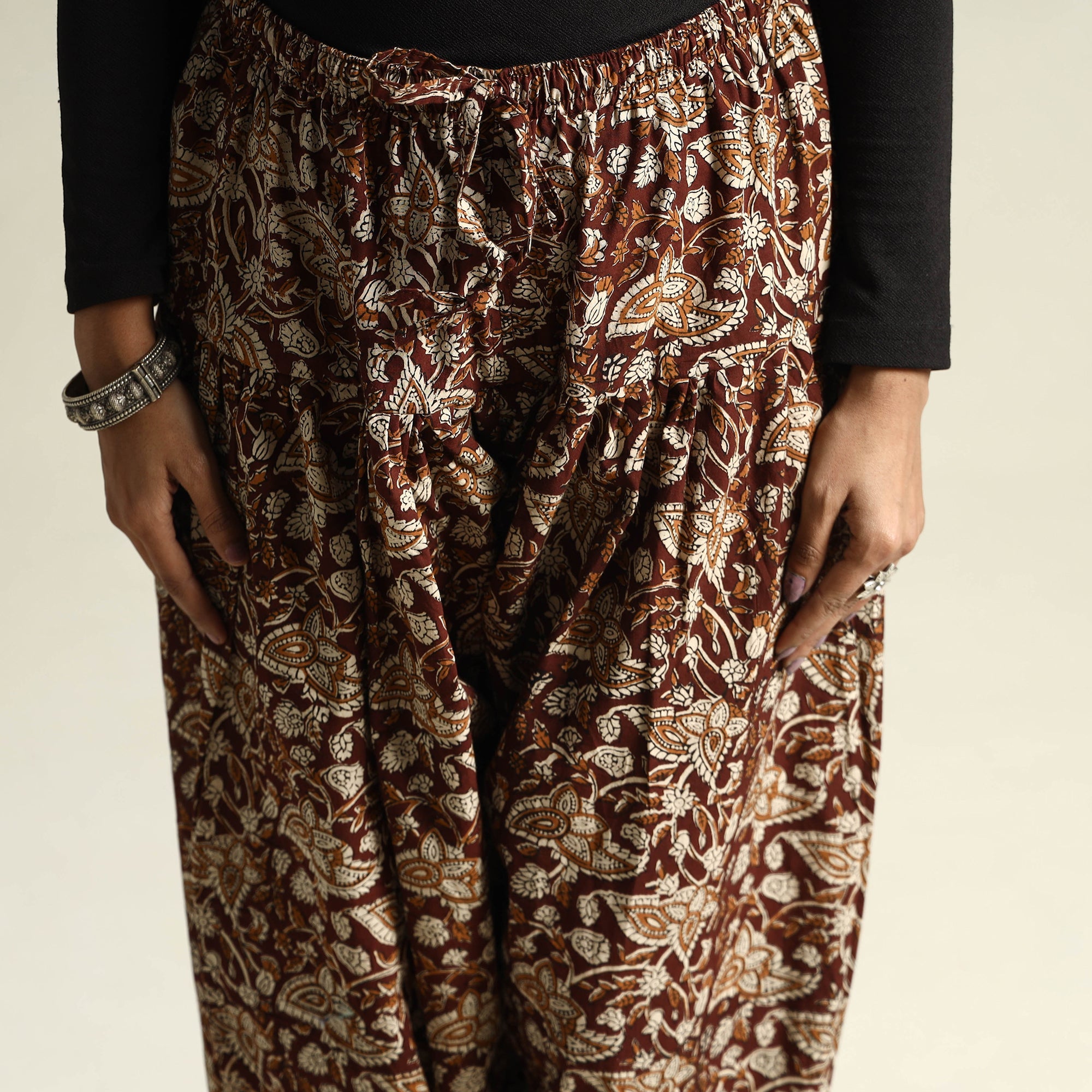 This bagru block-printed cotton elasticated salwar is a perfect blend of traditional artistry and modern comfort. Crafted with premium cotton, this salwar features traditional Bagru block prints, adding a touch of ethnic charm. This cotton salwar features an elasticized waist with a drawstring element that adds to the comfort quotient. The one-side pocket adds functionality to this salwar. This cotton salwar makes you feel comfortable and stylish all day long. This salwar is perfect for your daily outings.