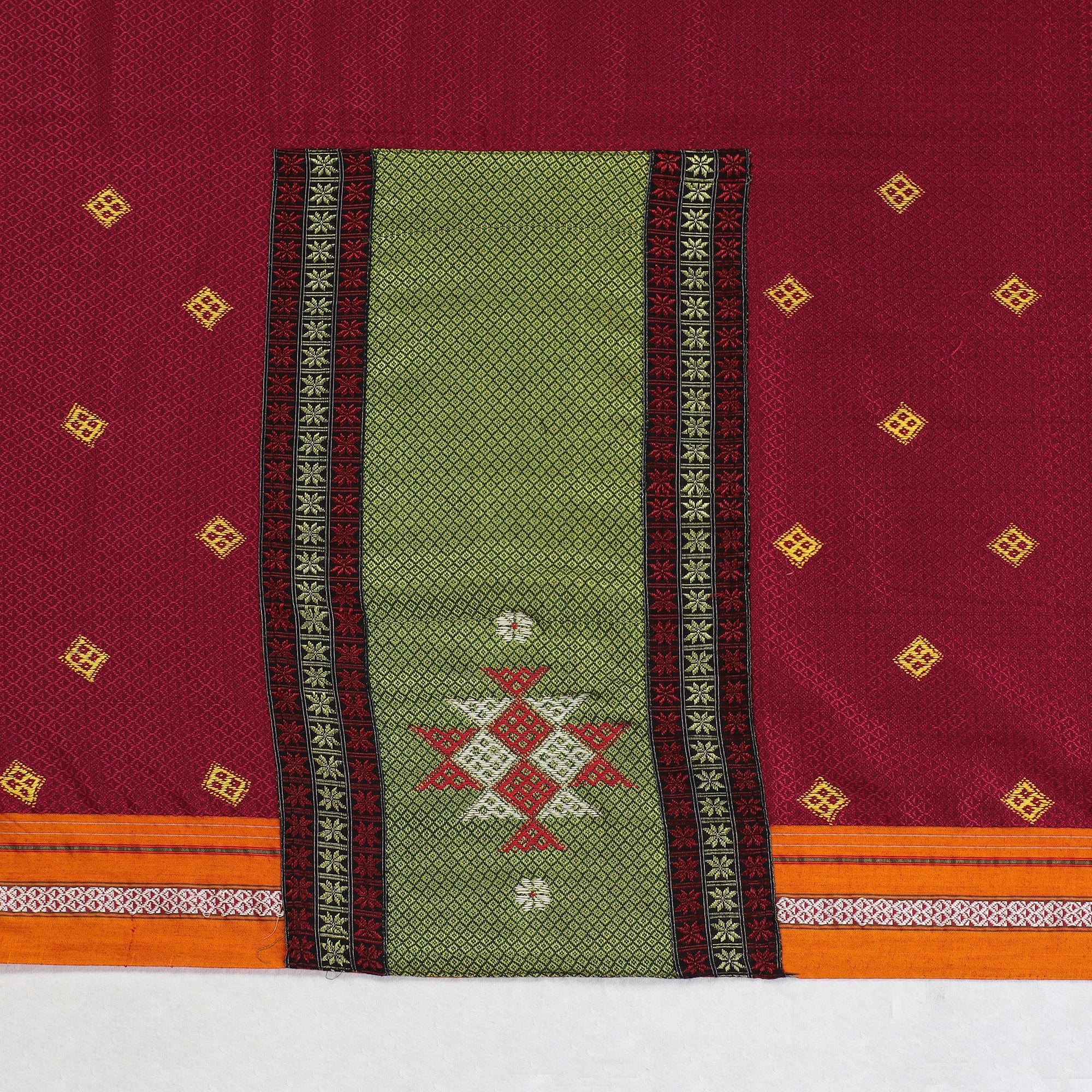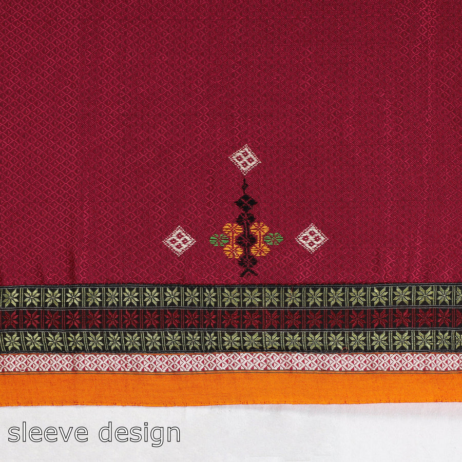 Intricate and artfully done kasuti hand embroidery on unstitched khun silk cotton blouse piece. The name Kasuti is derived from the words Kai (meaning hand) and Suti (meaning cotton), indicating an activity that is done using cotton and hands. Kasuti is the most intricate traditional form of embroidery practiced in the state of Karnataka, India.