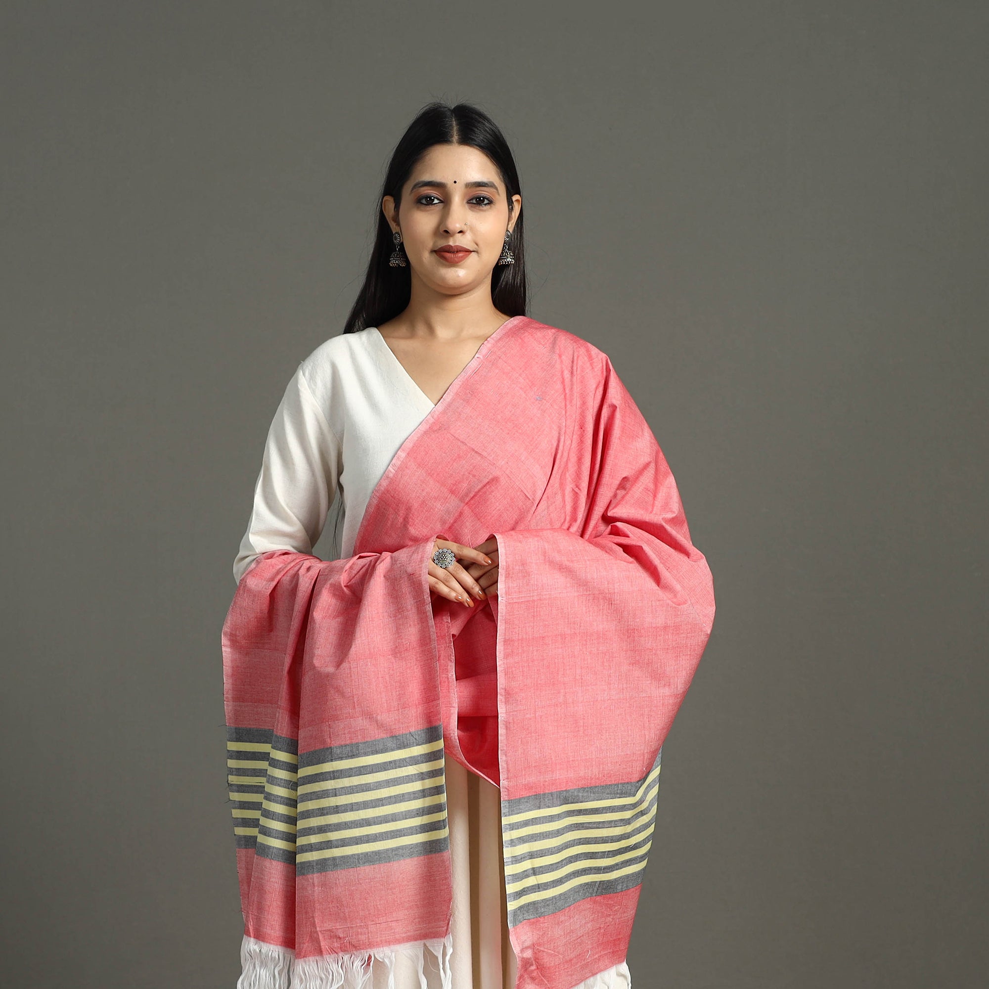 Fine quality peach chendamangalam kuriappilly pure handloom cotton dupatta. Chendamangalam is a village of handloom weavers in the western region of Ernakulam district in Kerala. These products are made from the best and fine quality cotton yarn. The specialty of these products lies in the preparation of warp thread by street sizing. The wrap thread becomes almost round and uniforms in shape. Designs in these products appear very prominently on both sides border and cross the border. This dupatta adds a touch of cultural charm to any outfit.