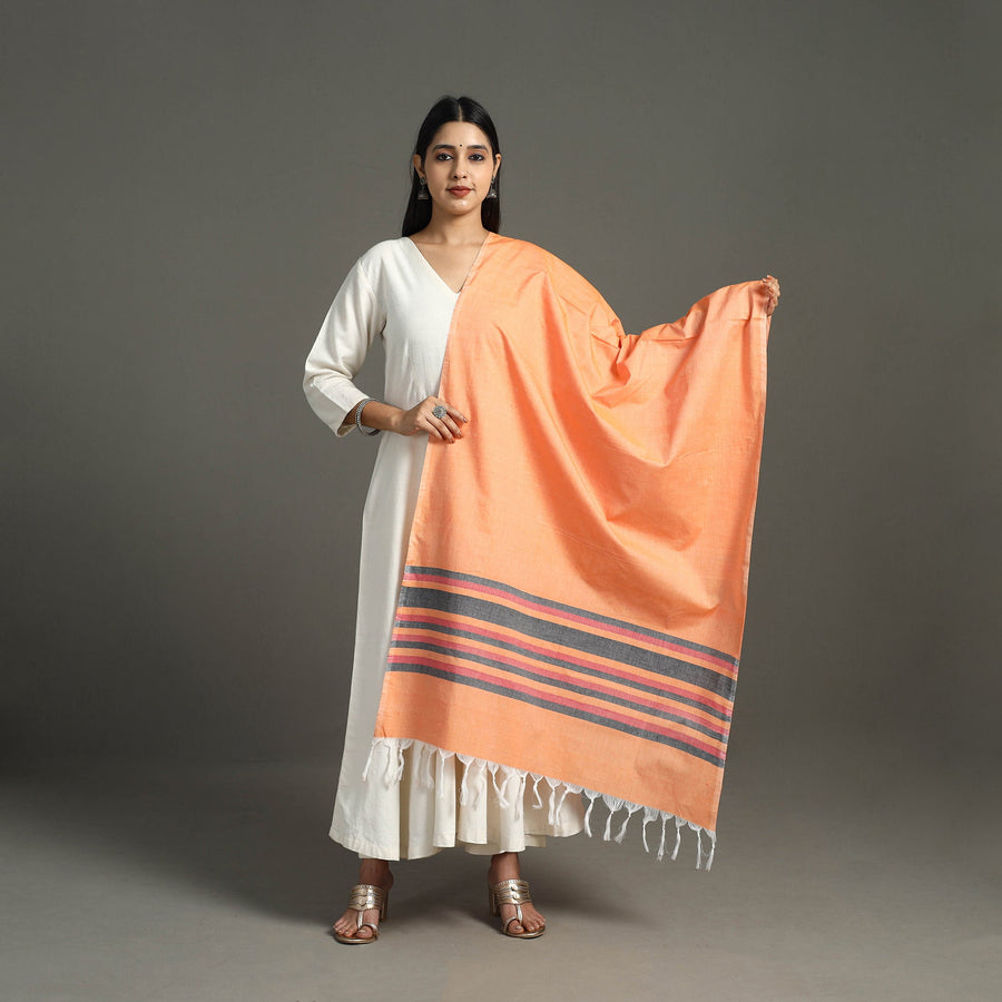 Fine quality orange chendamangalam kuriappilly pure handloom cotton dupatta. Chendamangalam is a village of handloom weavers in the western region of Ernakulam district in Kerala. These products are made from the best and fine quality cotton yarn. The specialty of these products lies in the preparation of warp thread by street sizing. The wrap thread becomes almost round and uniforms in shape. Designs in these products appear very prominently on both sides border and cross the border. This dupatta adds a touch of cultural charm to any outfit.