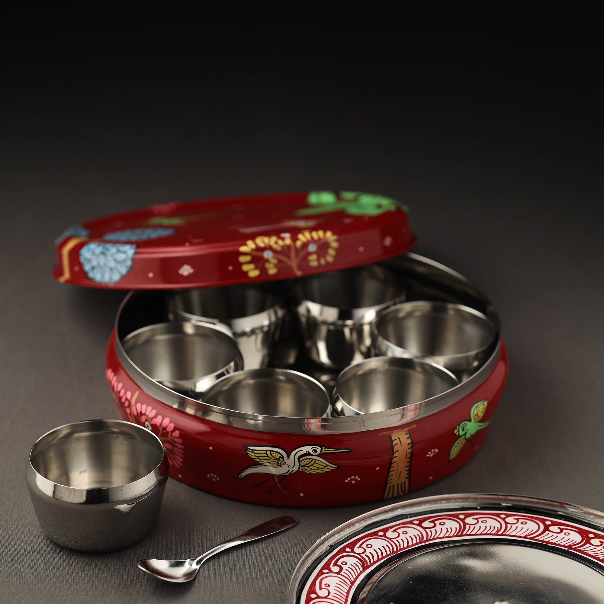 Red pattachitra handpainted with waterproof oil-based paint on high quality stainless steel masala box by the artisans of Odisha. It has inner steel lid with seven small masala containers (for spices) and one small spoon inside. It offers both organization and elegance, adding a touch of artistic richness to your kitchen space.