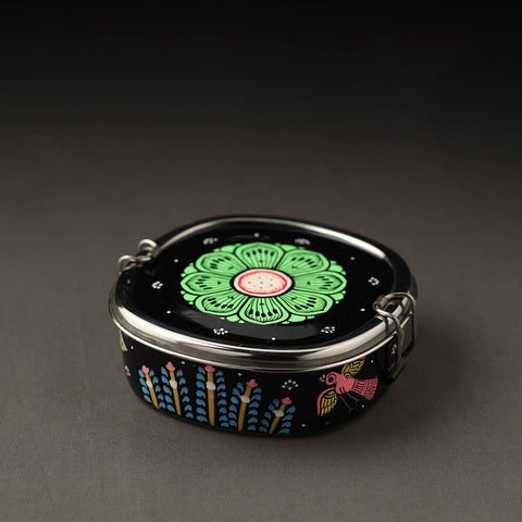 Black pattachitra handpainted with waterproof oil-based paint on high quality stainless steel chakra lunch box by the artisans of Odisha. Crafted from durable stainless steel, it ensures both style and practicality. Ideal for storing and transporting meals or snacks, this unique lunch box makes every meal a delightful and stylish affair, adding a touch of cultural richness to your daily routine.