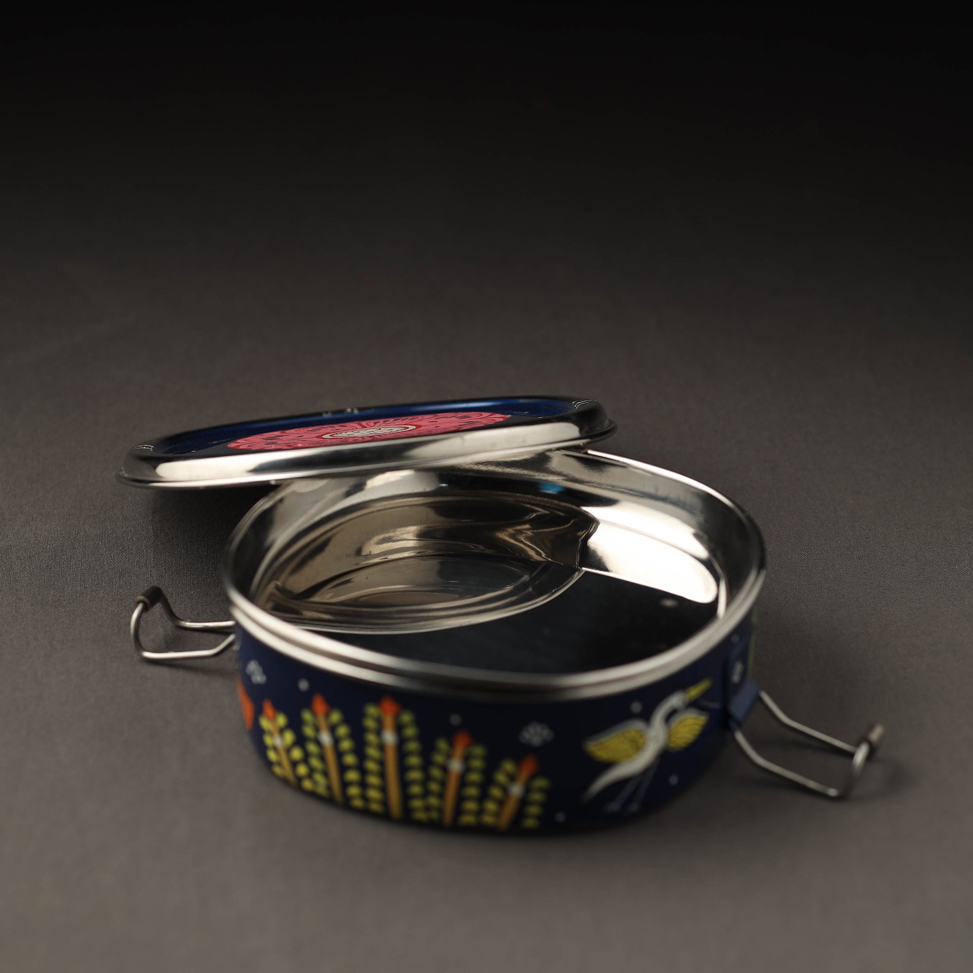 Blue pattachitra handpainted with waterproof oil-based paint on high quality stainless steel chakra lunch box by the artisans of Odisha. Crafted from durable stainless steel, it ensures both style and practicality. Ideal for storing and transporting meals or snacks, this unique lunch box makes every meal a delightful and stylish affair, adding a touch of cultural richness to your daily routine.