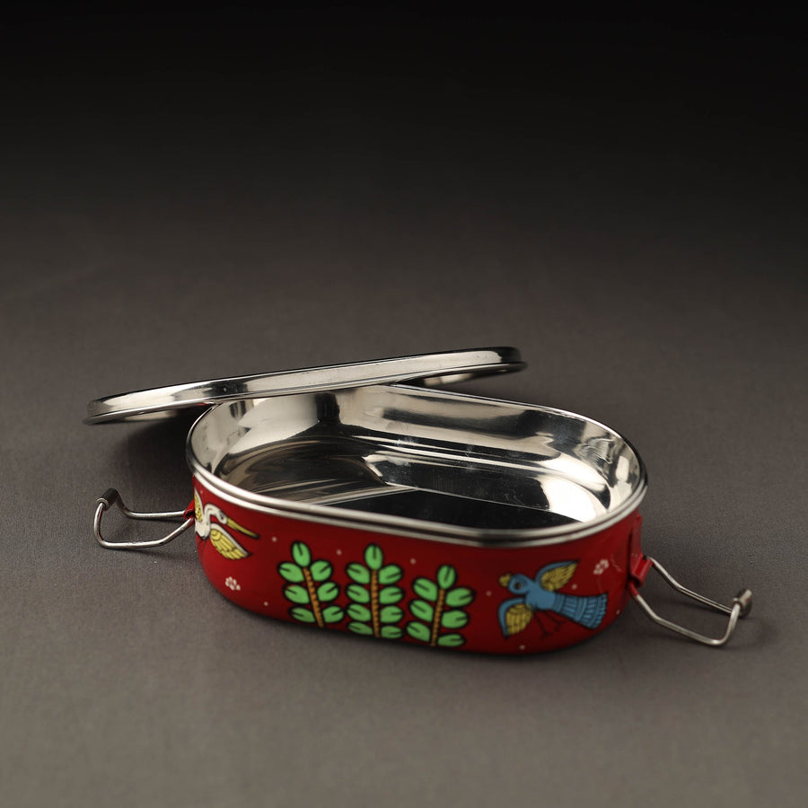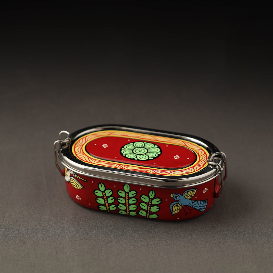 Red pattachitra handpainted with waterproof oil-based paint on high quality stainless steel capsule lunch box by the artisans of Odisha. Crafted from durable stainless steel, it ensures both style and practicality. Ideal for storing and transporting meals or snacks, this unique lunch box makes every meal a delightful and stylish affair, adding a touch of cultural richness to your daily routine.