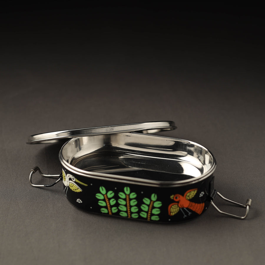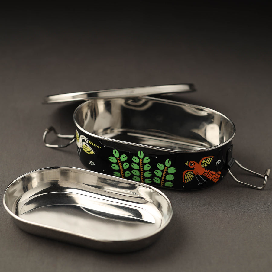 Black pattachitra handpainted with waterproof oil-based paint on high quality stainless steel capsule lunch box by the artisans of Odisha. Crafted from durable stainless steel, it ensures both style and practicality. Ideal for storing and transporting meals or snacks, this unique lunch box makes every meal a delightful and stylish affair, adding a touch of cultural richness to your daily routine.