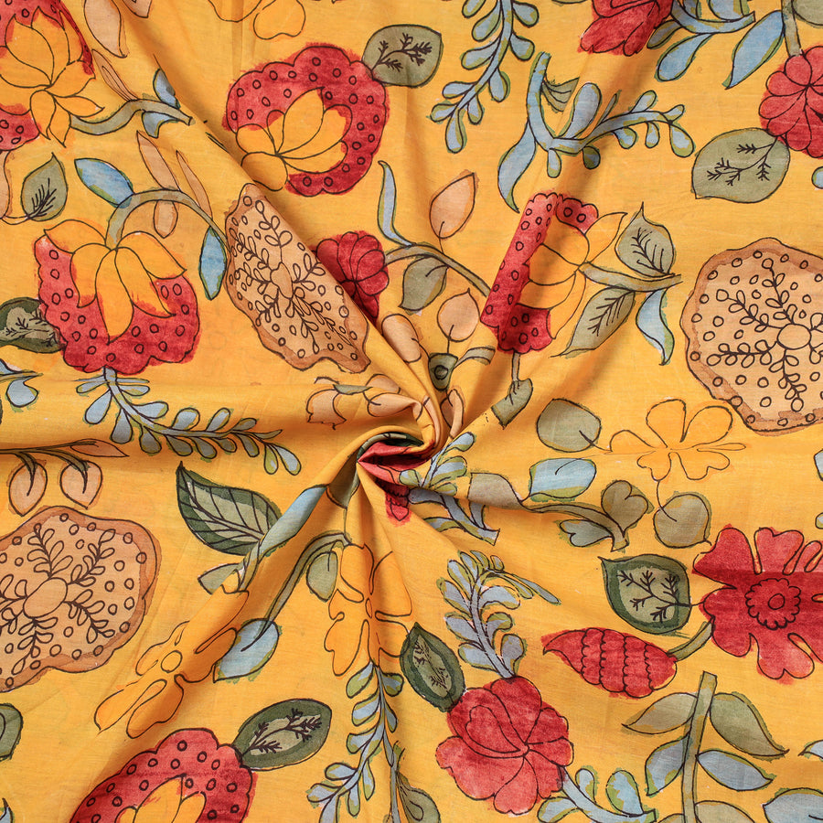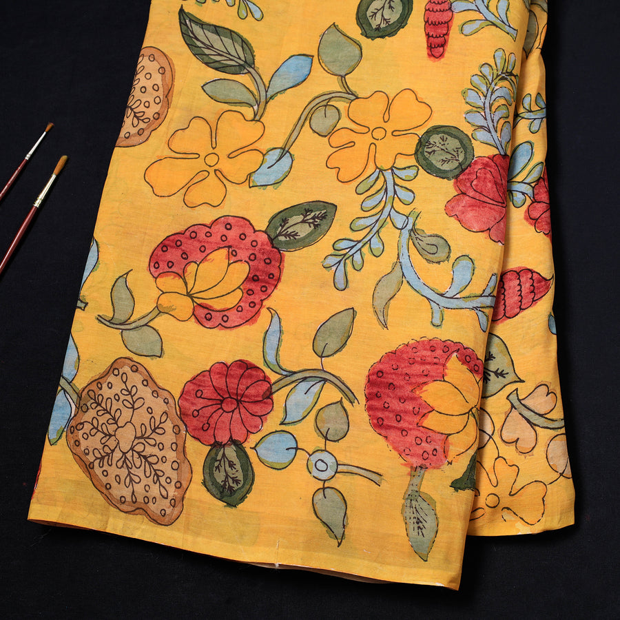 This is a handcrafted chanderi silk fabric featuring the intricate srikalahasti style of kalamkari pen work. The fabric is known for its gossamer looks and amazing feel and is entirely hand-worked using natural colors. The srikalahasti style of kalamkari involves using a pen for freehand drawing of the subject and filling in the colors. This technique has been practiced for approximately 200 years in srikalahasti, and the artists here retain the ancient techniques of dyeing passed down from generations. As it is hand-painted and handcrafted, variations in color and design may occur, adding to the unique beauty of the piece. As it is hand-painted/handcrafted, color spread and irregularities in design is common; hence, it won't be considered as damaged or defective.