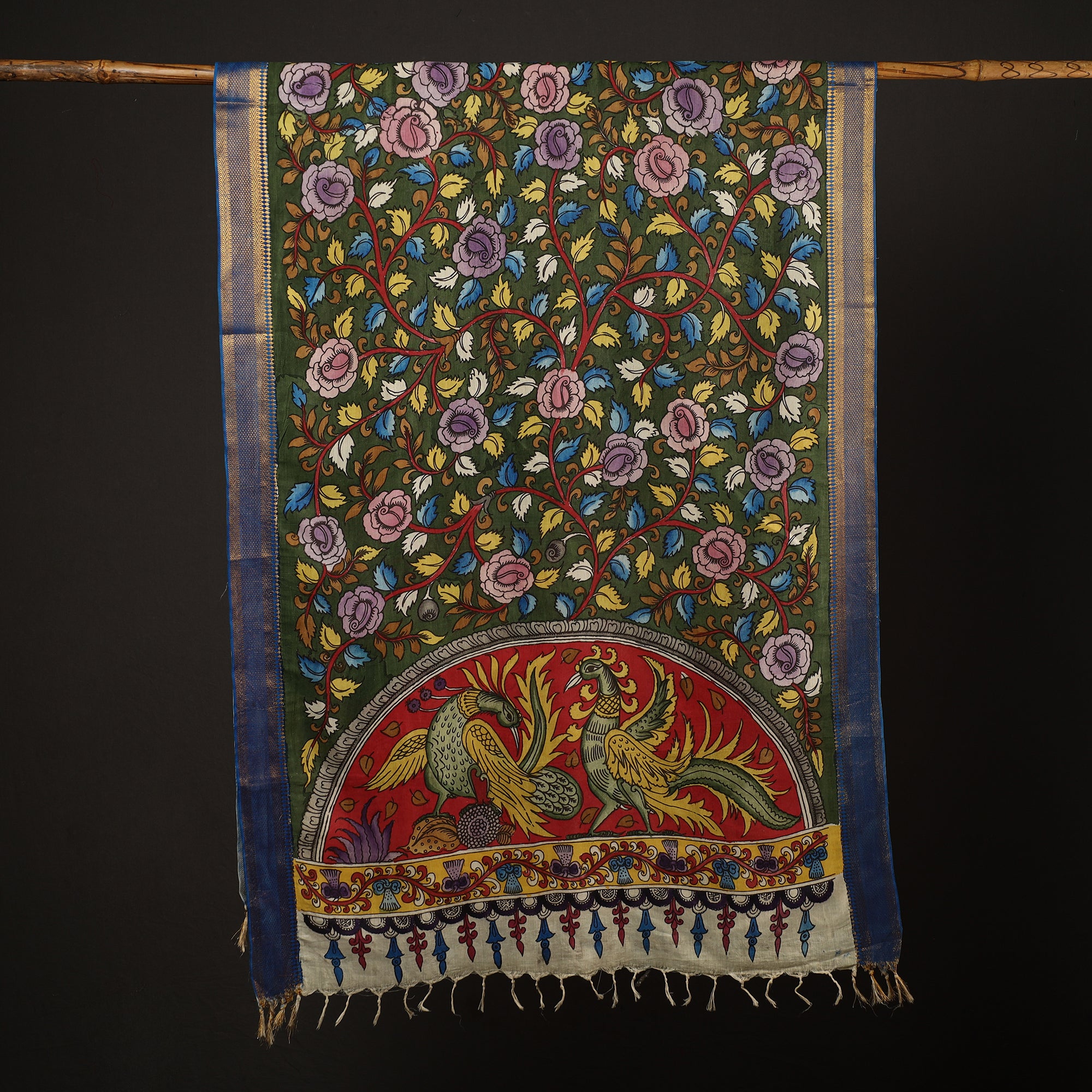 Fine-quality green srikalahasti pen work handpainted kalamkari chanderi silk-cotton zari border dupatta with tassels. This exquisite dupatta is created with srikalahasti style of kalamkari, wherein the "kalam" or pen is used for free-hand drawing of the subject and filling in the colors. It is entirely hand worked using natural colors. Kalamkari in srikalahasti has been around for approximately 200 years. Unlike other places where this particular craft is practiced, artists in srikalahasti retain the ancient techniques of dyeing that have been passed down from generations. As it is hand-painted/handcrafted, color spread and irregularities in design is common; hence, it won't be considered damaged or defective.