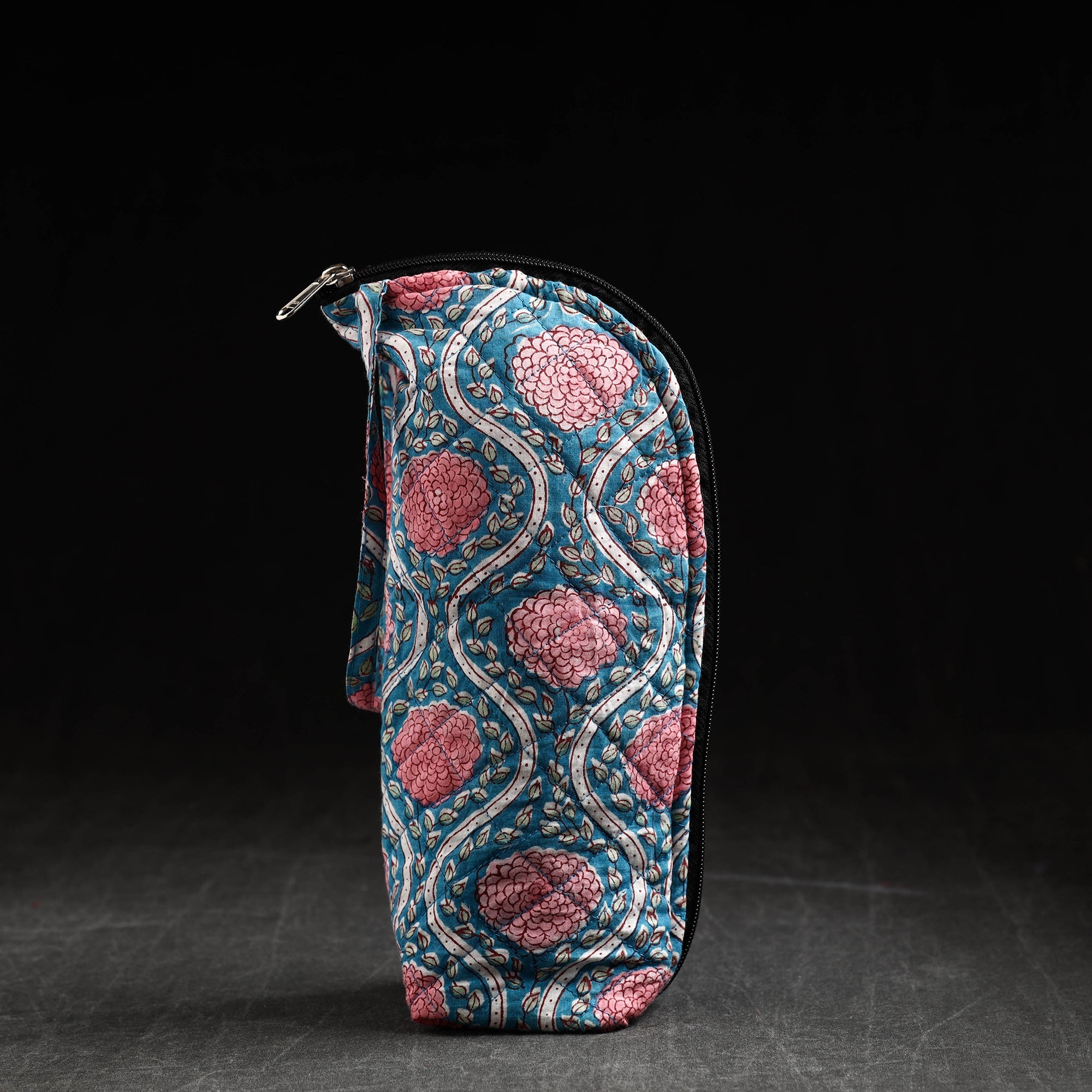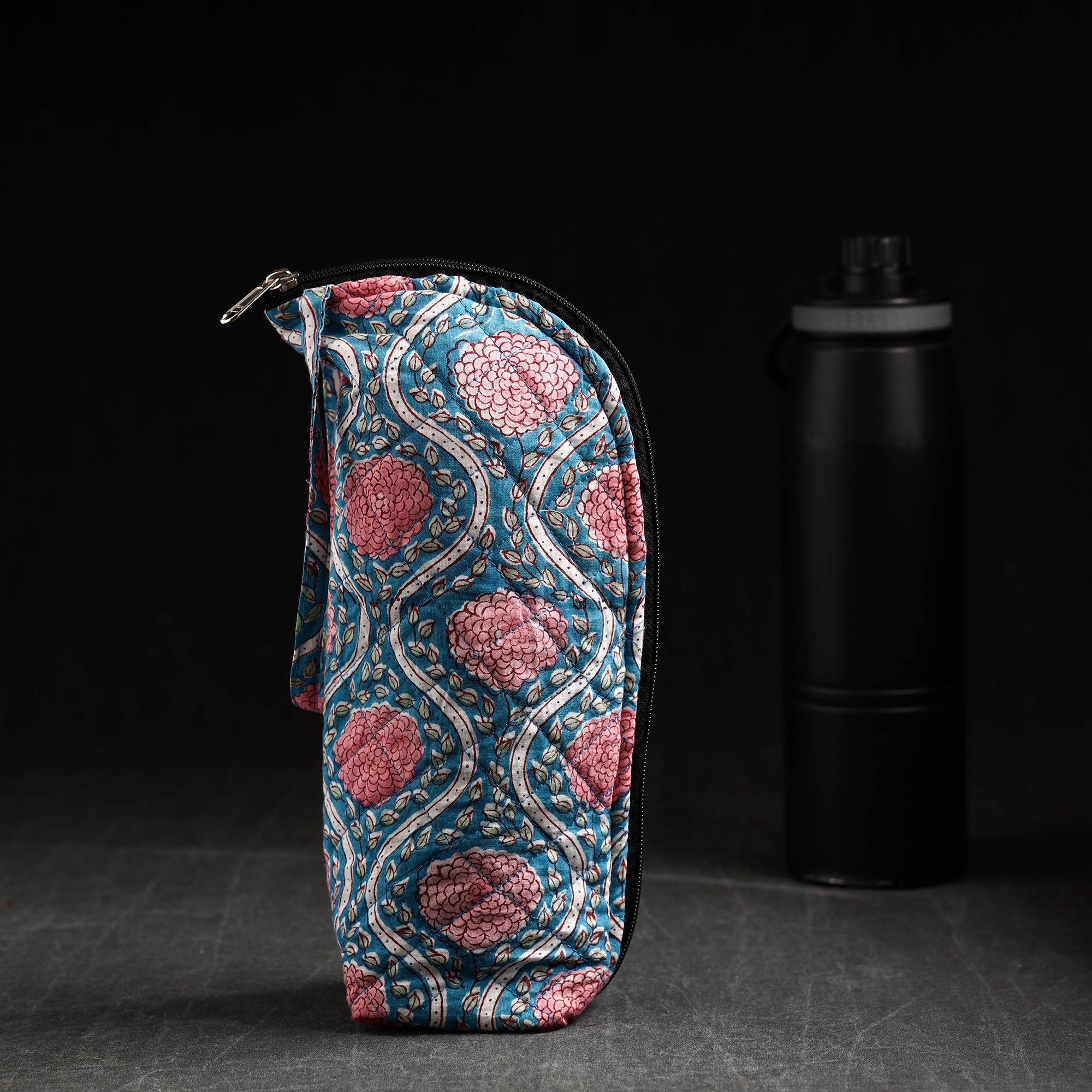 This blue sanganeri block-printed cotton water bottle cover is a charming blend of tradition and functionality. It has a cotton lining inside and a zipper main closure. Crafted from high-quality cotton, this cover adds a touch of elegance to your hydration routine. Designed to fit most bottles, it keeps your drink insulated and protects the bottle from scratches or dents while making a fashion statement.