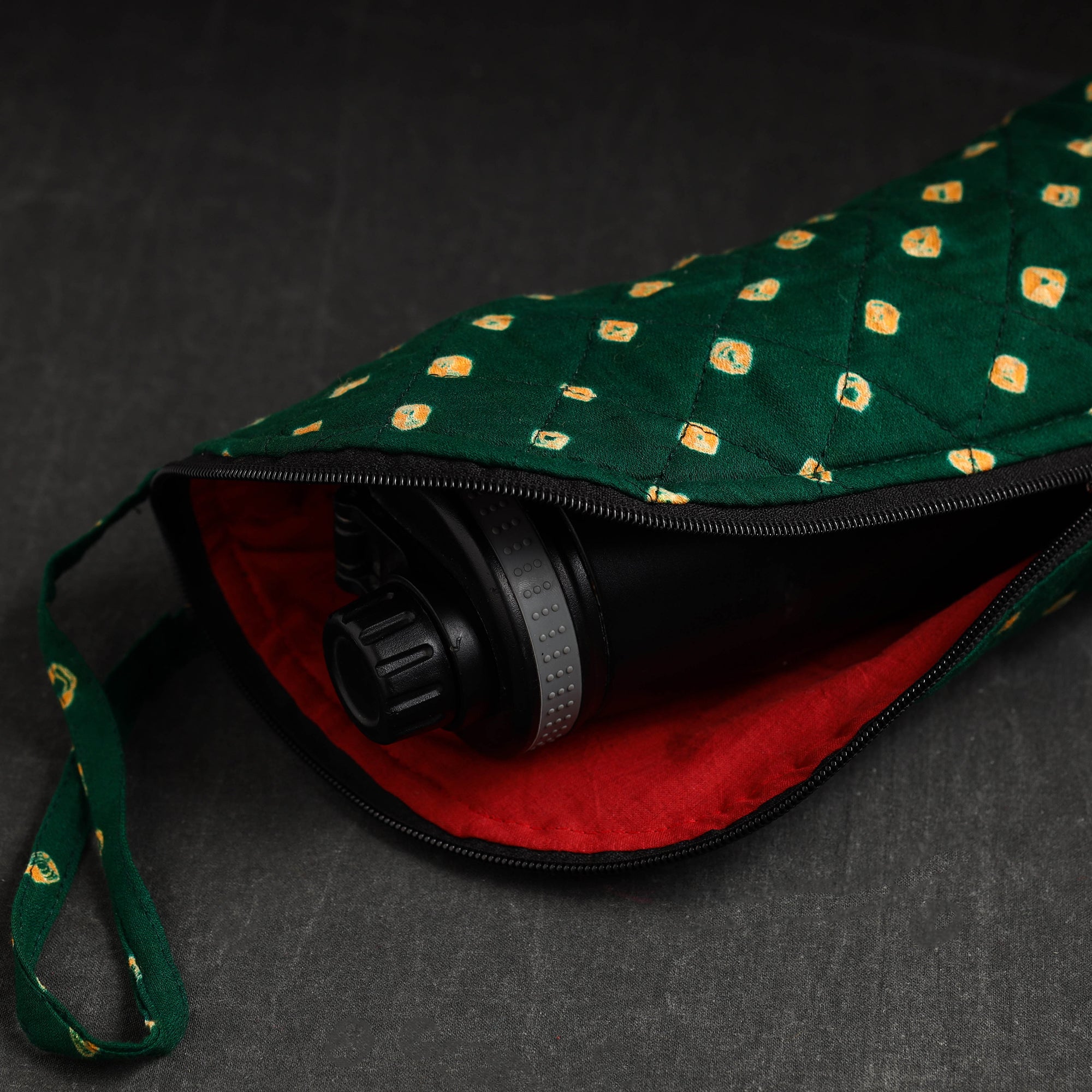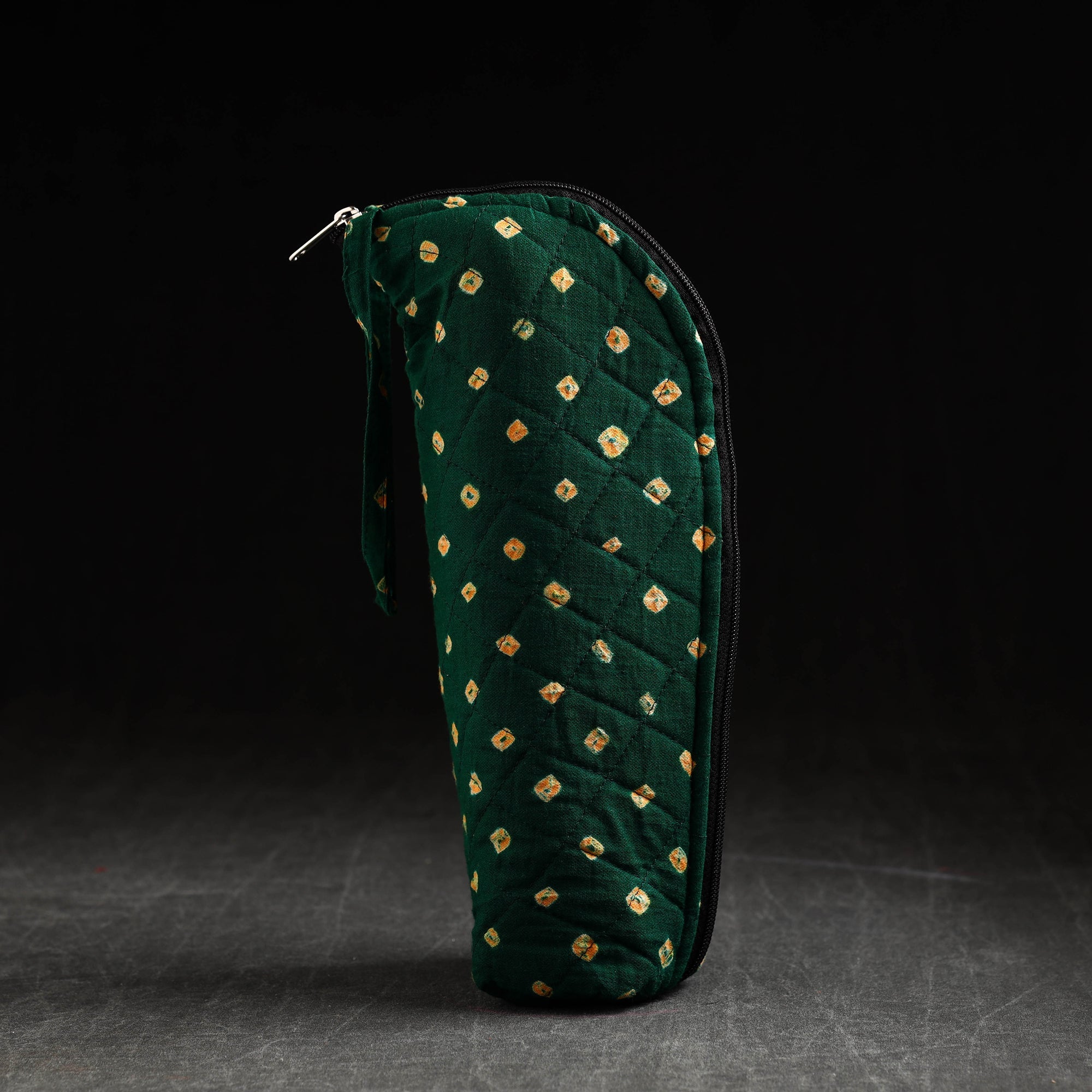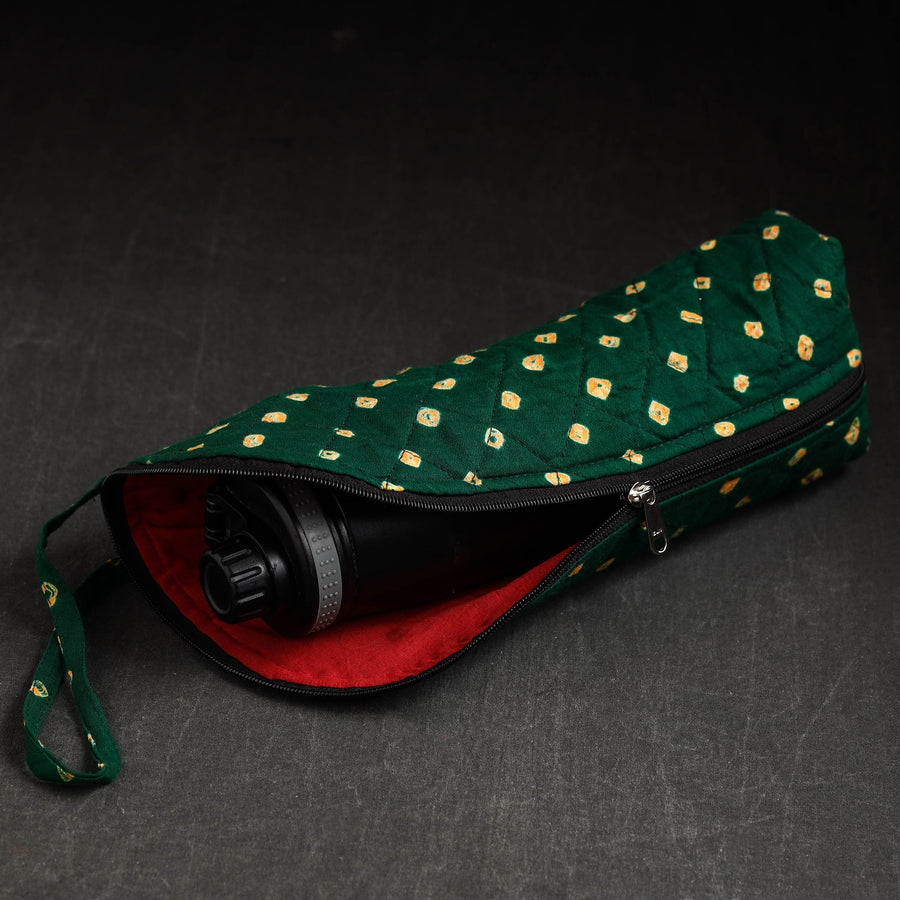 This bandhani tie-dye green cotton water bottle cover is a charming blend of tradition and functionality. It has a cotton lining inside and a zipper main closure. Crafted from high-quality cotton, this cover adds a touch of elegance to your hydration routine. Designed to fit most bottles, it keeps your drink insulated and protects the bottle from scratches or dents while making a fashion statement.