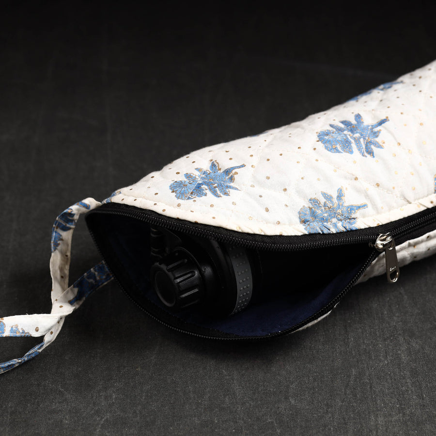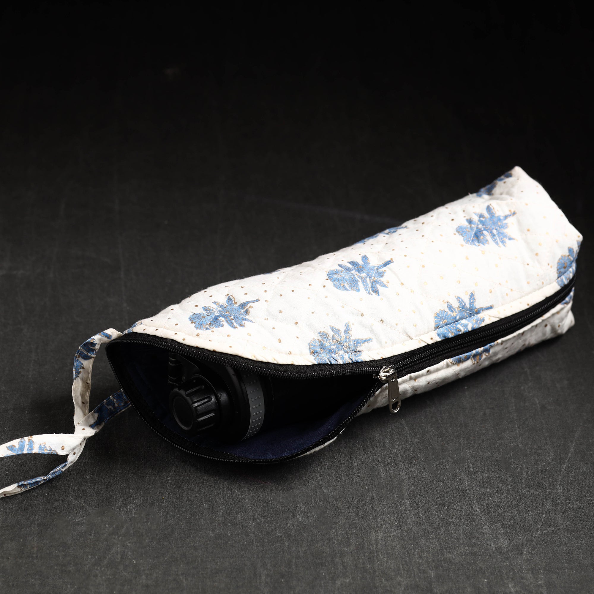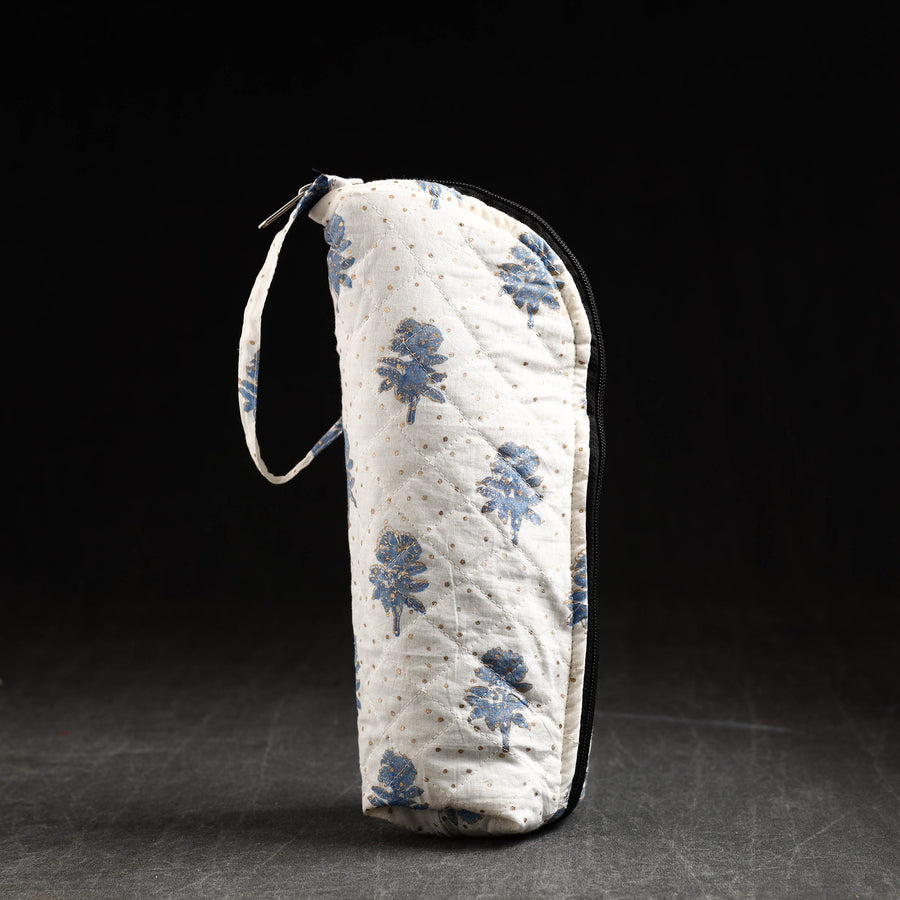This white sanganeri block-printed cotton water bottle cover is a charming blend of tradition and functionality. It has a cotton lining inside and a zipper main closure. Crafted from high-quality cotton, this cover adds a touch of elegance to your hydration routine. Designed to fit most bottles, it keeps your drink insulated and protects the bottle from scratches or dents while making a fashion statement.