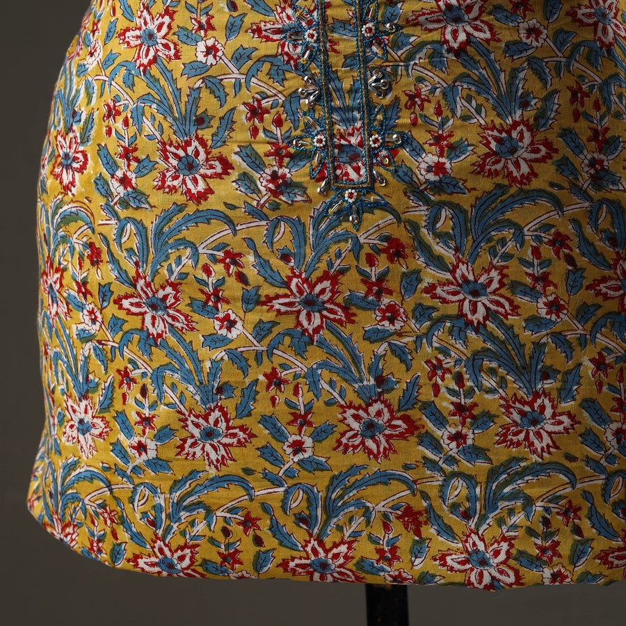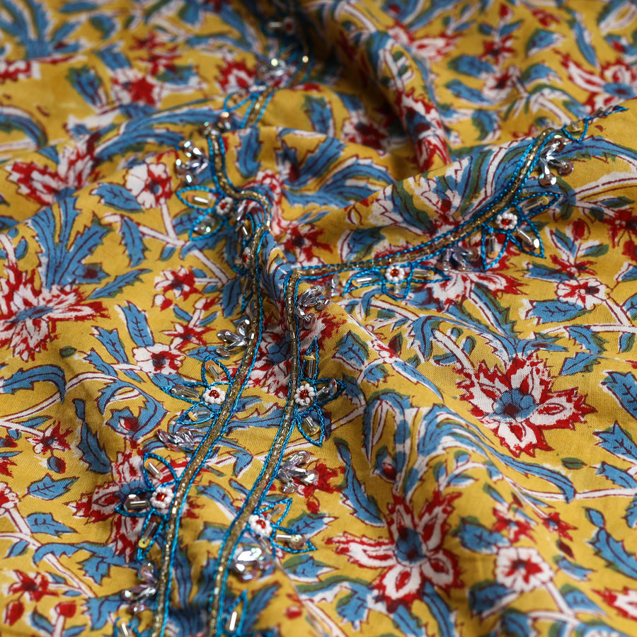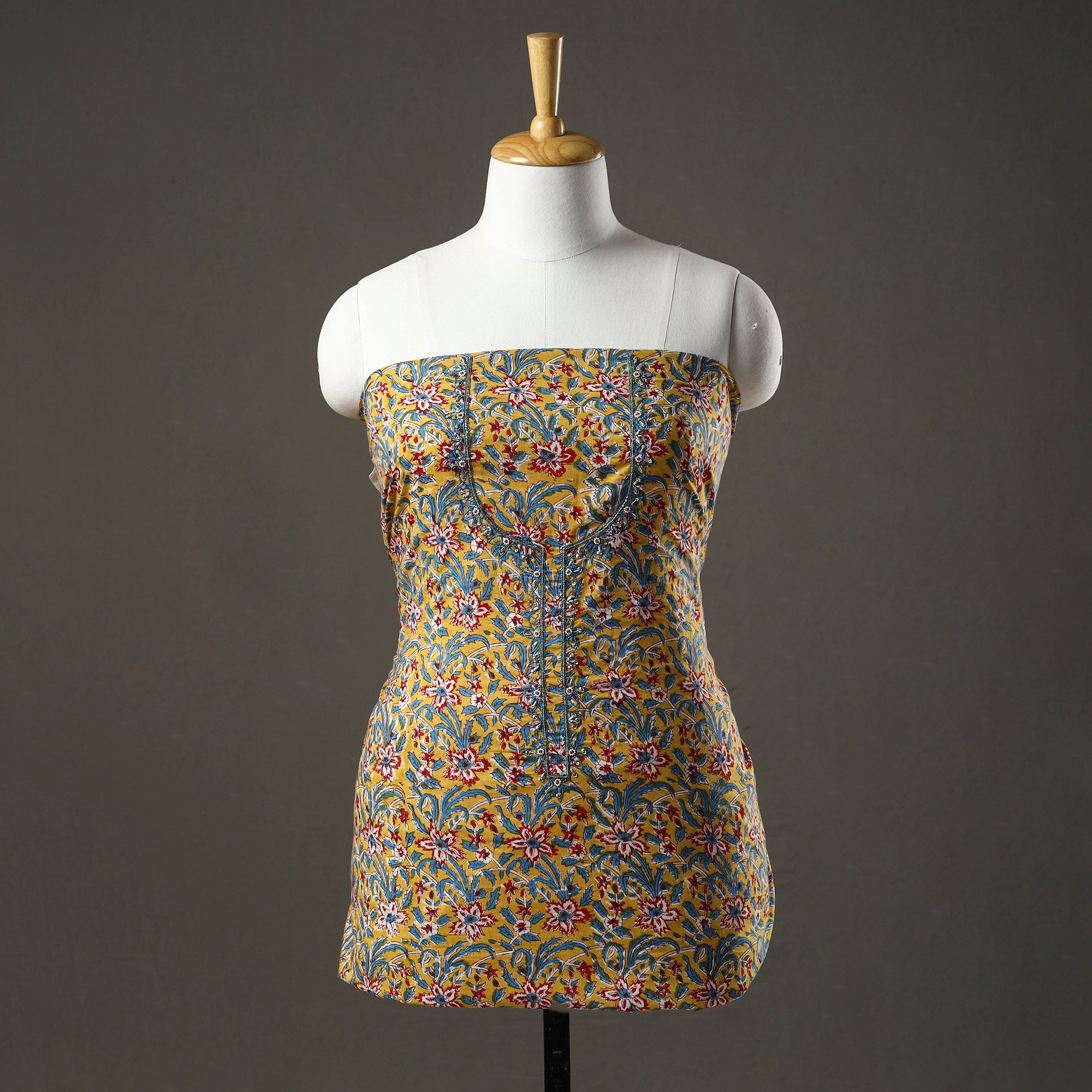 Experience the timeless allure of sanganeri block print cotton kurta material, meticulously embellished with intricate embroidery and delicate beads. Sanganeri is a hand-block printing technique that originated in Sanganer, a village in the southern part of Jaipur, Rajasthan. Perfect for creating elegant kurta sets that effortlessly blend tradition and style, ensuring a graceful presence on any occasion.