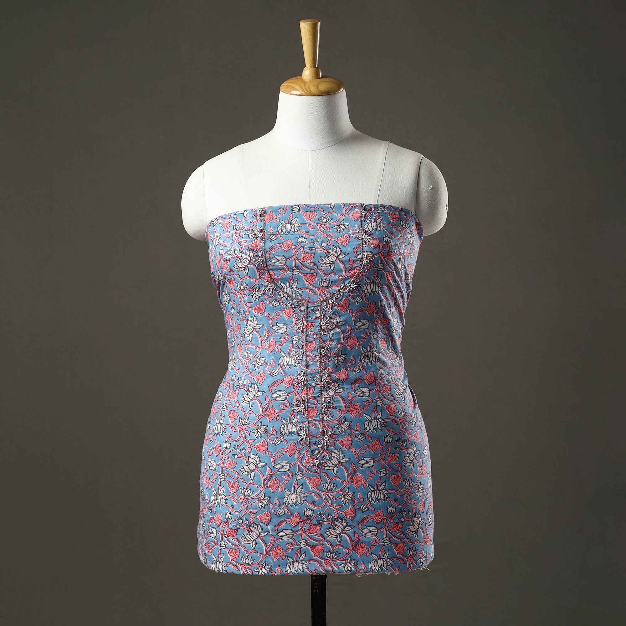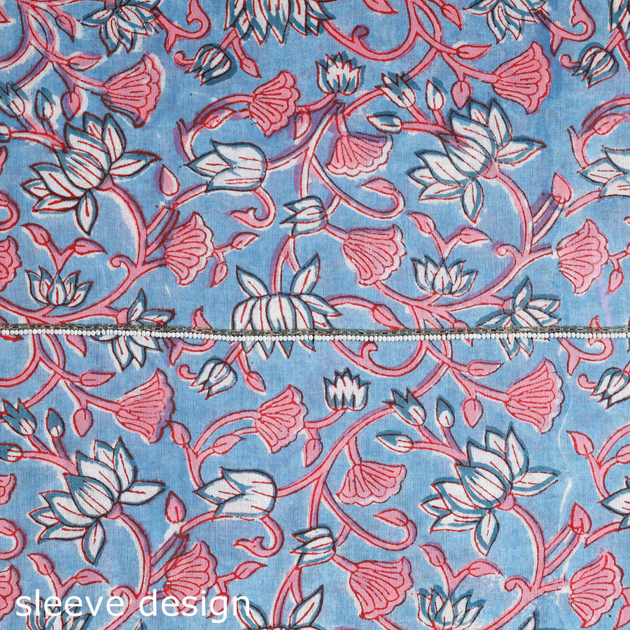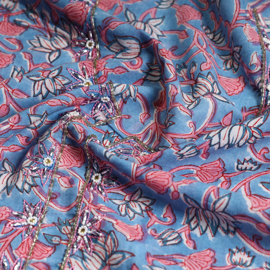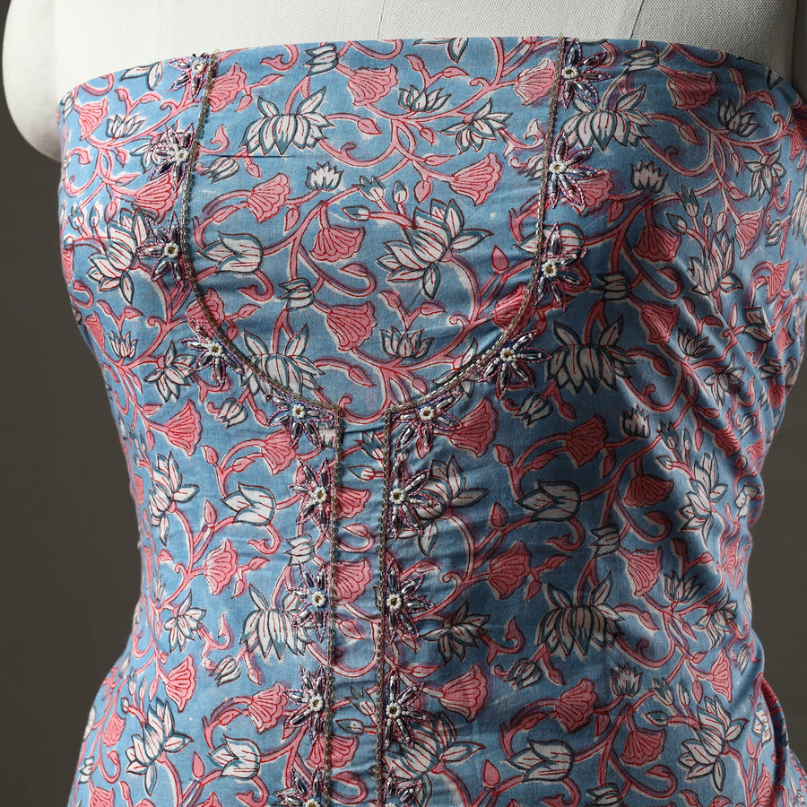 Experience the timeless allure of sanganeri block print cotton kurta material, meticulously embellished with intricate embroidery and delicate beads. Sanganeri is a hand-block printing technique that originated in Sanganer, a village in the southern part of Jaipur, Rajasthan. Perfect for creating elegant kurta sets that effortlessly blend tradition and style, ensuring a graceful presence on any occasion.