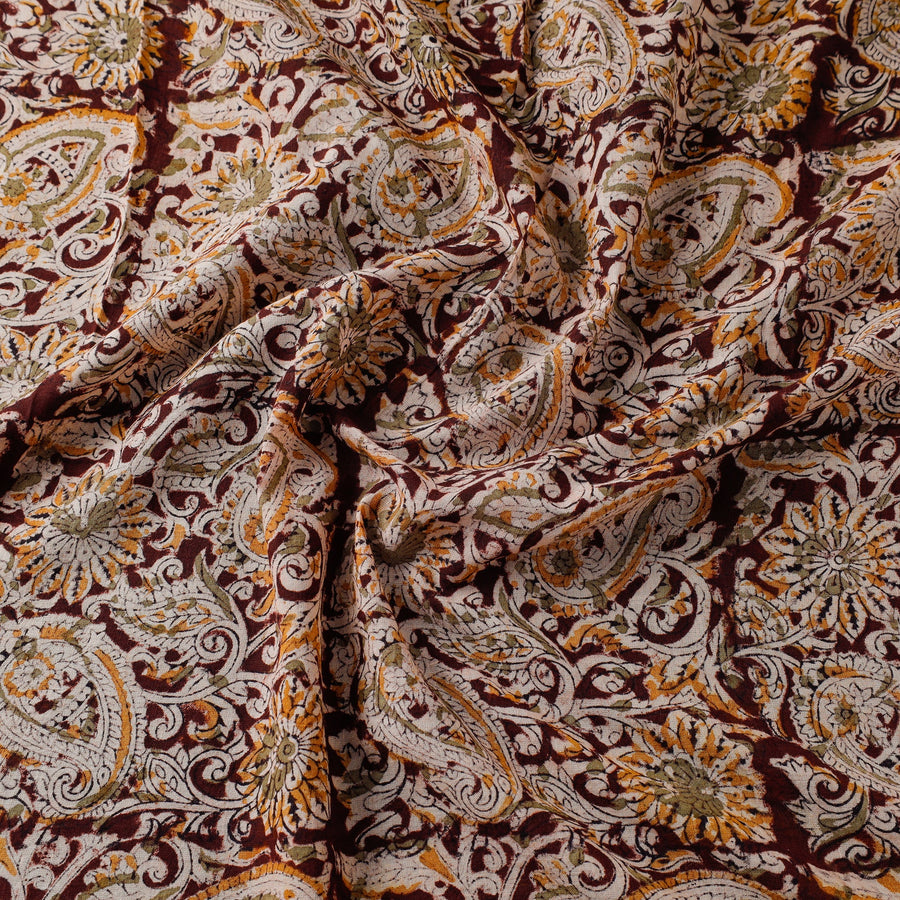 This mul cotton fabric is skillfully crafted by the artisans of Pedana using traditional kalamkari block printing techniques. It showcases an assortment of hand-printed motifs inspired by the traditional kalamkari painting. The fabric is naturally dyed and of fine quality. Kalamkari is one of the earliest and most complex techniques of block printing.
