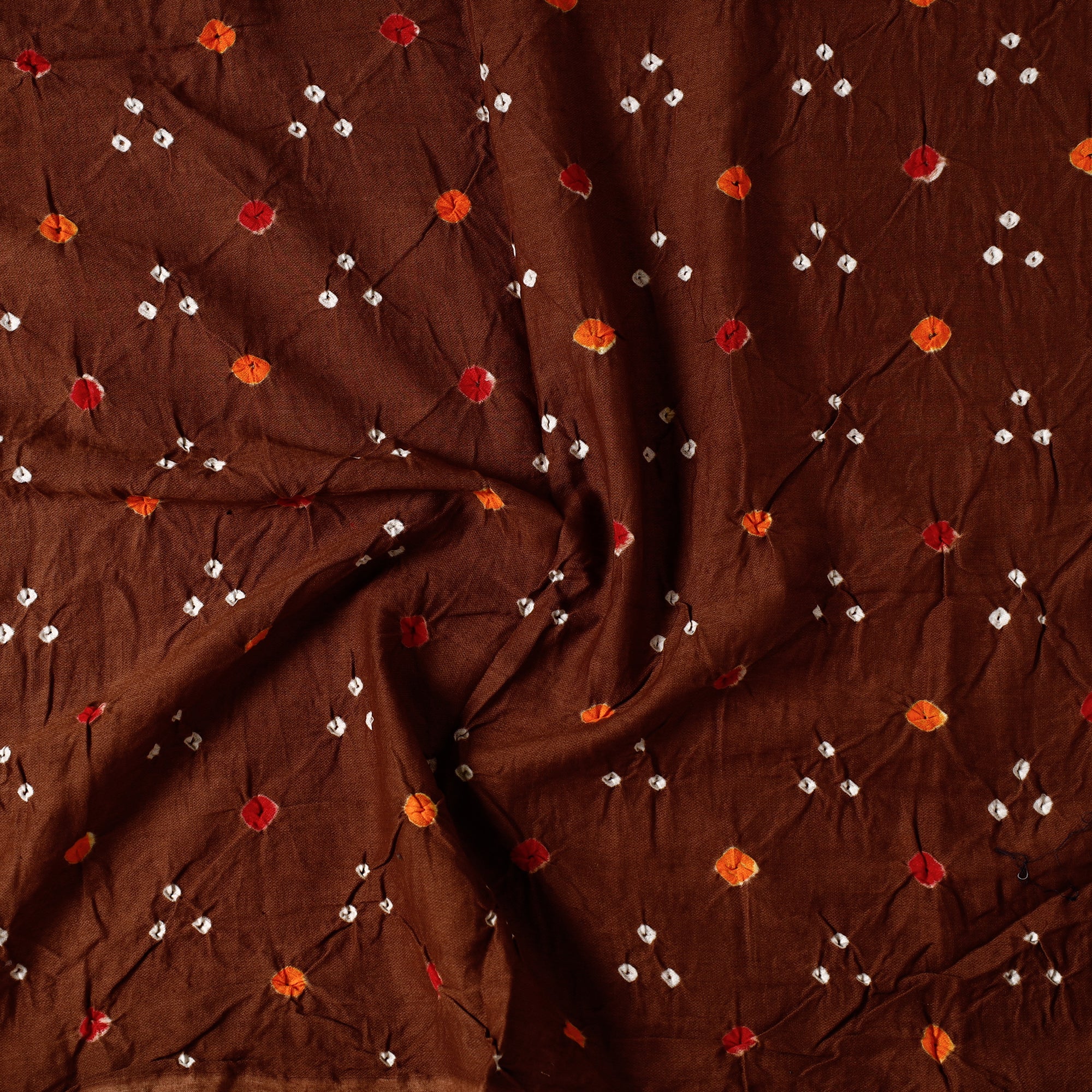 Fine-quality brown bandhani tie-dye cotton precut fabric. Featuring a majestic bandhani pattern, this fabric is hand-tied and dyed using the traditional technique practiced by the artisans of Kutch. Perfect for crafting elegant blouses, bags, decorative items, etc., this exquisite textile symbolizes timeless sophistication, adding a touch of elegance to any wardrobe.